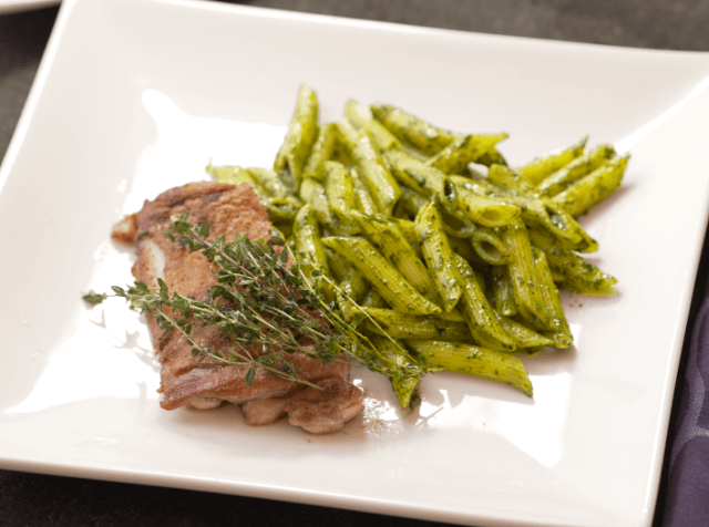 メインの「マットーネ」はレンガのこと。鶏肉に重石をしてスパイスとともに香ばしく焼き上げ、鮮やかな手づくりジェノベーゼのペンネと一緒にお召し上がりください。