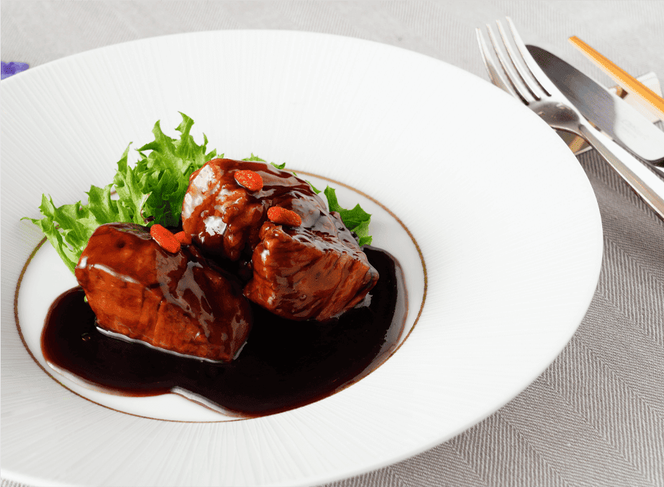 揚げずに煮込んだあっさり豚肩ロース肉にコクのある黒酢ダレを絡ませた黒酢酢豚は「桃の木」のスペシャリテ。黒酢ダレではプロのひと技もレクチャーいたします。