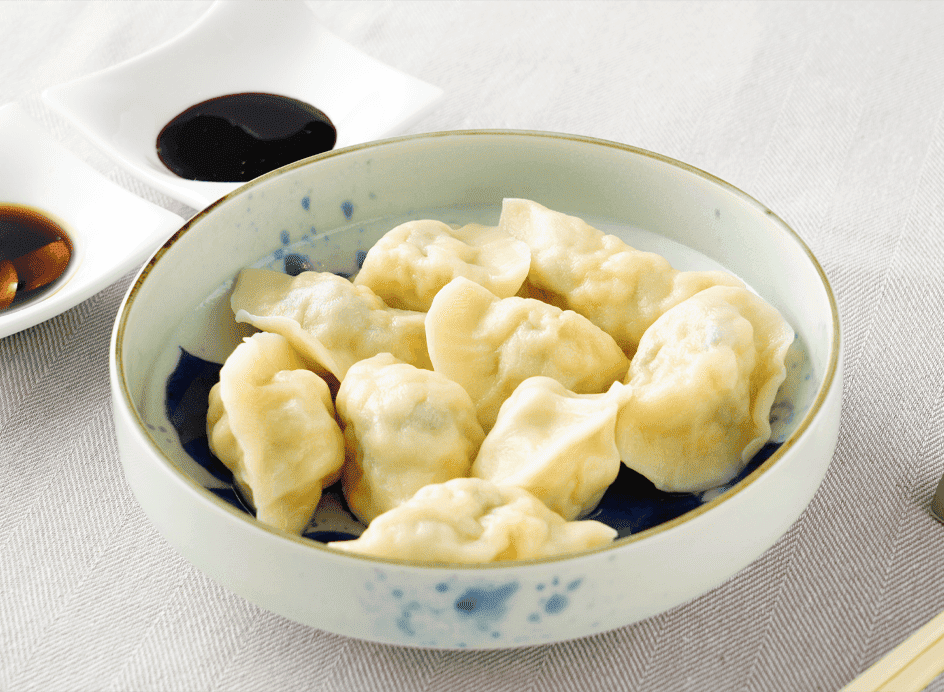 ヘルシーに卵と青菜を包んだ水餃子は餃子の皮から手作りします。市販の皮では味わえないもちもち食感の水餃子をお楽しみください。