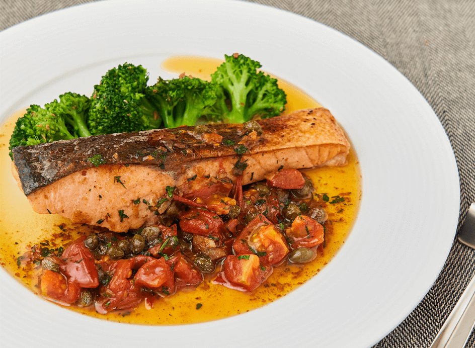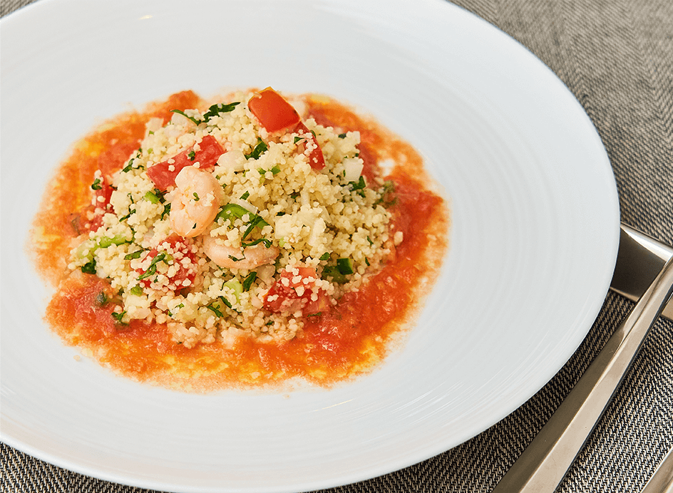 メインはサーモンの皮をカリっと焼き上げ、焦がしバターソースと一緒にお召し上がりいただくハレの日にも使える『サーモンのムニエル』。サイドは世界最小パスタとも言われる「クスクス」を使ったサラダ『タブレ』。フランス人が大好きなサラダです。ミントとトマトがさわやかなサラダは夏だけでなく乾燥が気になるこれからの季節にもお薦めの一皿。洋食とフランス料理が癒合する榊原シェフの料理をお楽しみください。