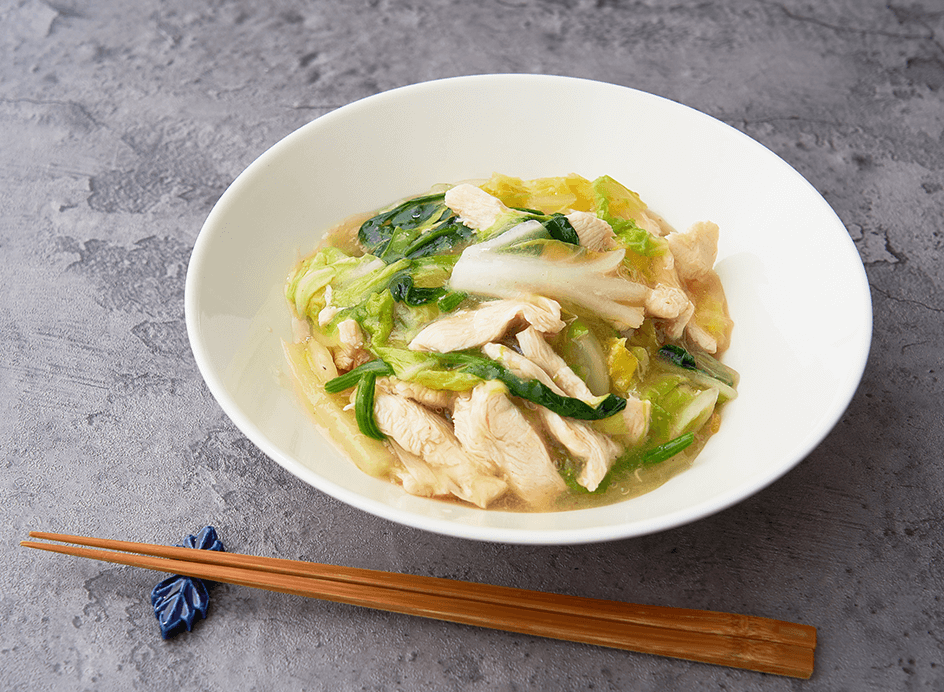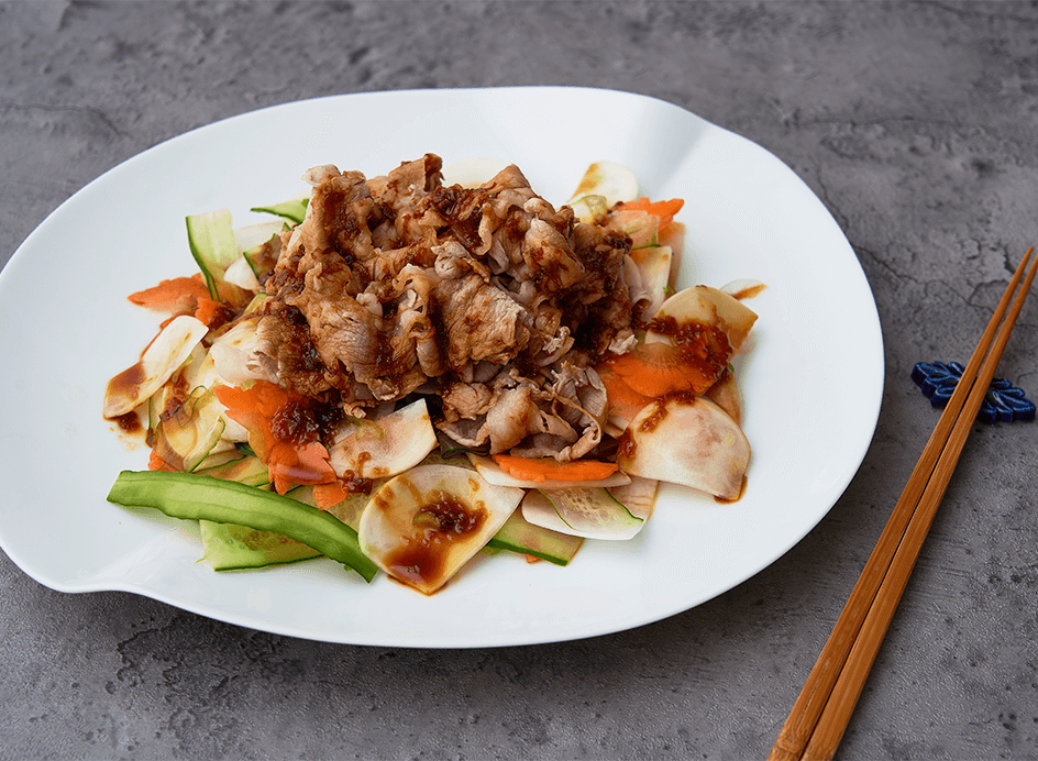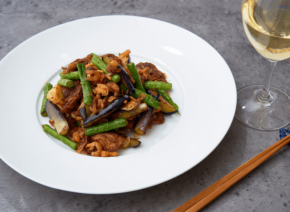 サイドディッシュ1つ目は『紅油豚肉』。薄くスライスした野菜と豚肉に、甘辛の万能ソースをかけて(お好みでラー油を加えて)お召し上がりいただきます。2つ目は『千炒茄子豆』。香りが良く、旨みのある香味炒めです。この料理は茄子を揚げる時の温度がポイント。また甜面醤や搾菜、フライドオニオンなどを隠し味に複雑な味わいに。ヘルシーに肉ではなく大豆ミートを使用して調理します。