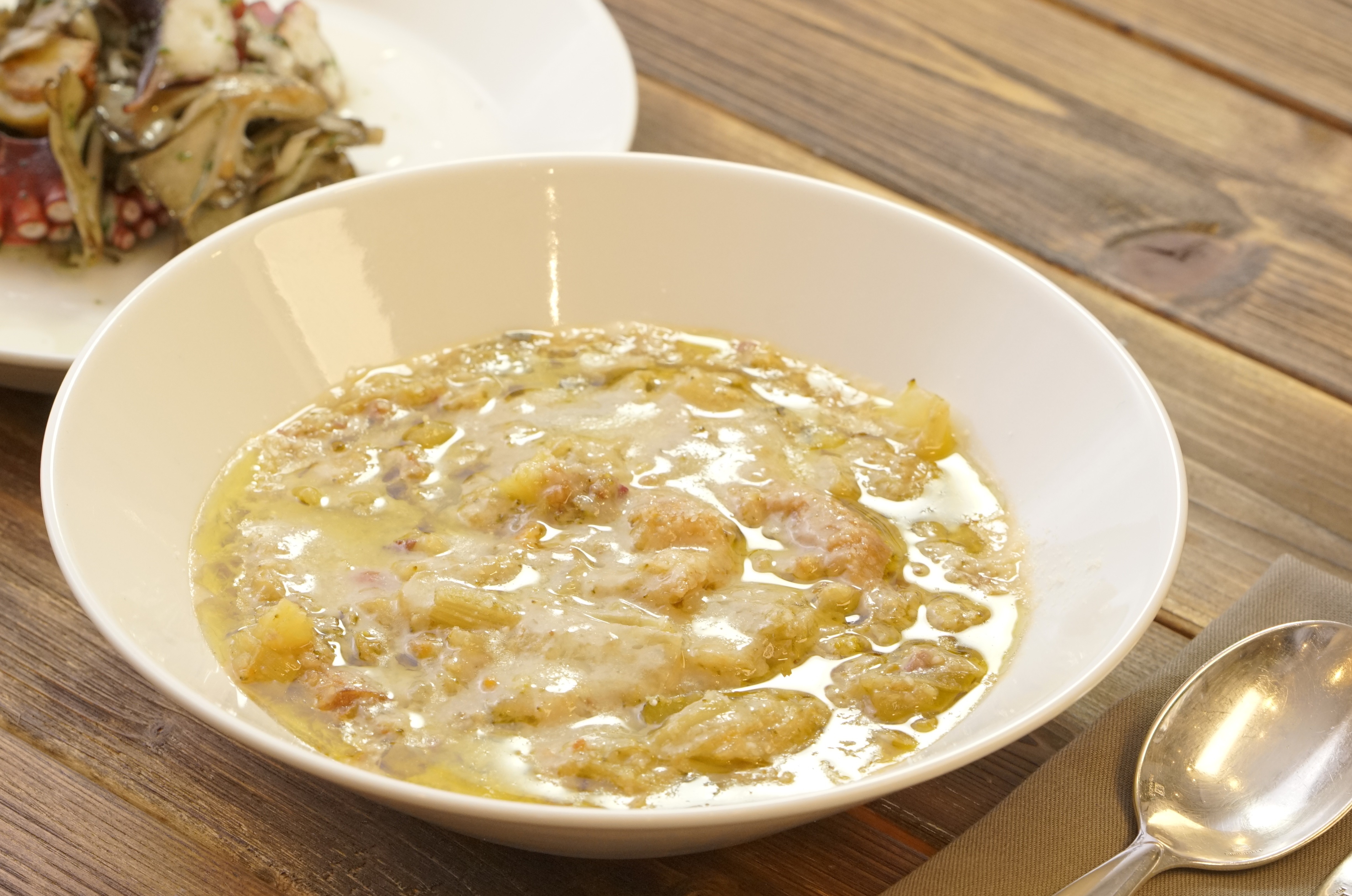 メインディッシュは具材がたっぷりの「食べるスープ」、ミネストローネ。10種の野菜をくたくたに煮込み、バゲットを加えたトスカーナ風の素朴な一皿です。飾り気はないものの、その優しい味わいは疲れた胃と心を癒し、食べ進めるほどにハマるシェフお気に入りの味です。一皿で満足感を得られます。(※冷凍保存可能)。サイドディッシュは「オイルに漬ける」ことを意味するソットオーリオ。茹で蛸とじっくり焼き上げた舞茸を、太白胡麻油でシンプルにマリネした一品です。
