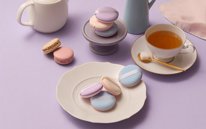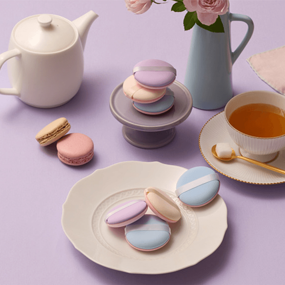 ふわふわの触り心地と、表裏で異なるバイカラー仕様。まるで本物のマカロンのような可愛らしさで、毎朝のメイクタイムをワクワクする特別な時間に変えてくれます。