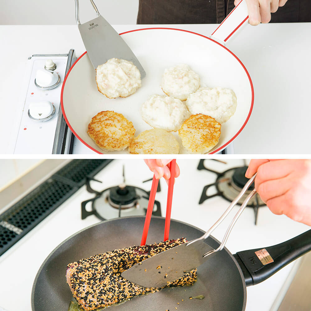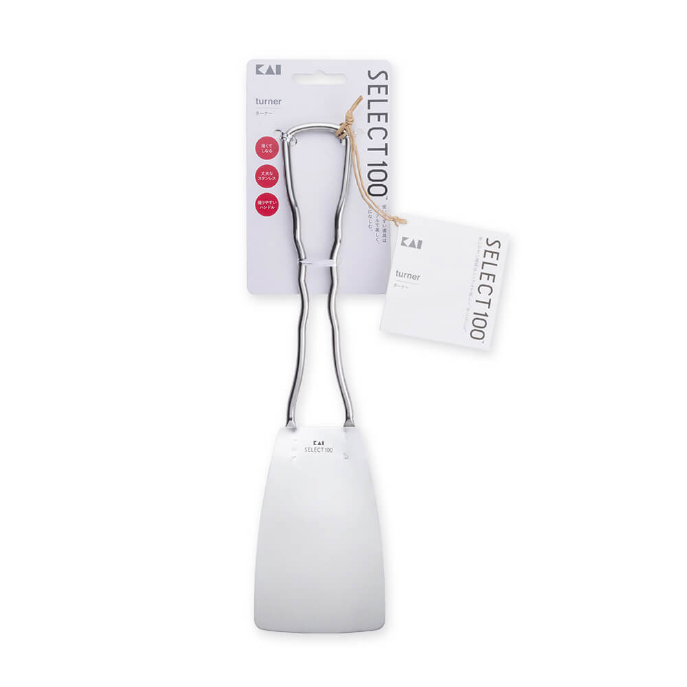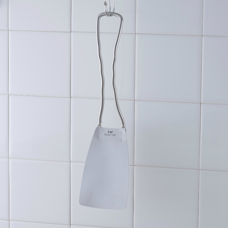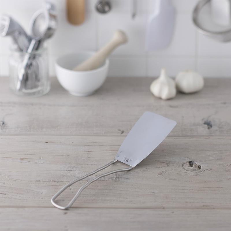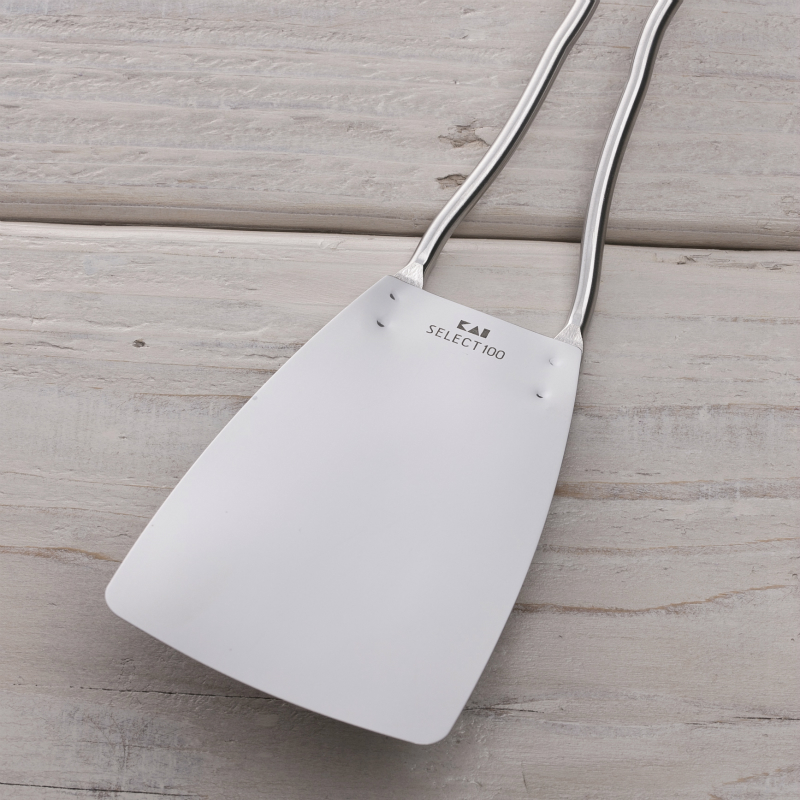 しなやかな弾力を持ち、食材の下に入りやすく、使いやすいターナー。返しやすい長さと大きさを考えました。ハンドルは持ちやすい十分な長さがあり、指がひっかけやすい形状です。