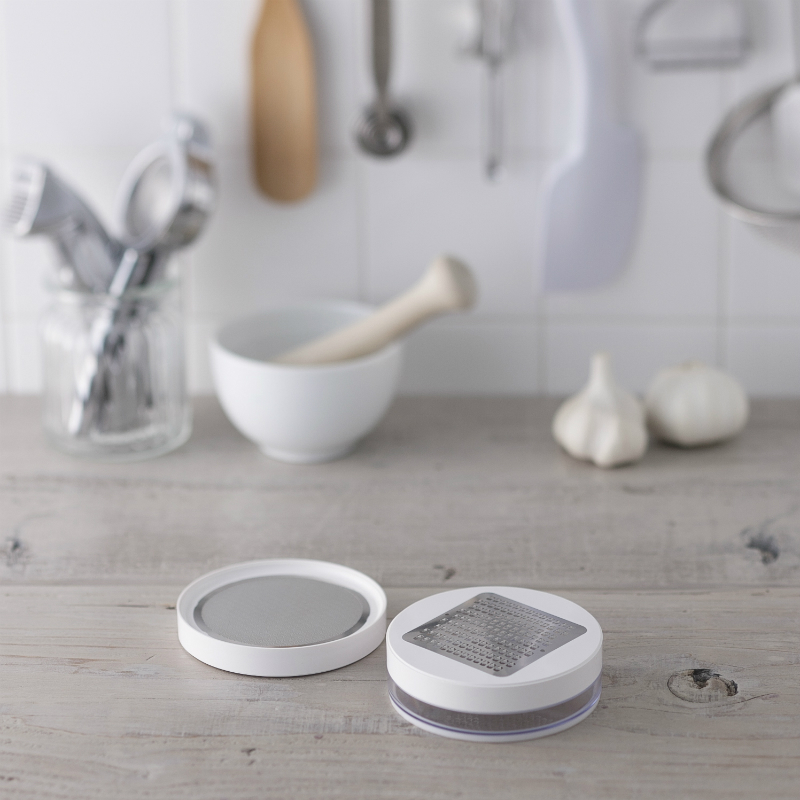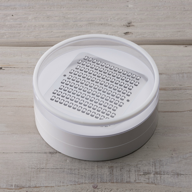 しょうが用は、繊維をカットしながらおろせる構造になっているので、とっても軽い力でおろすことが出来ます。切るようにおろす為、しょうがの“ヒゲ”が残らないので、保存時にはラップでしっかり包めます。おろした生姜は受け皿に落ちる点も使いやすいポイントです。