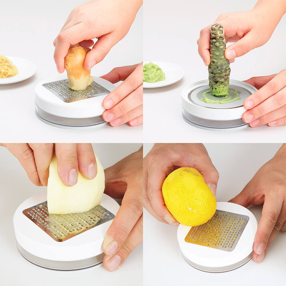 生姜やワサビの味わいが、このアイテムで変わります!!エッチングという、特殊加工技術を使って実現できた薬味おろし器。セットする受け皿の底面は滑り止めの加工がされています。