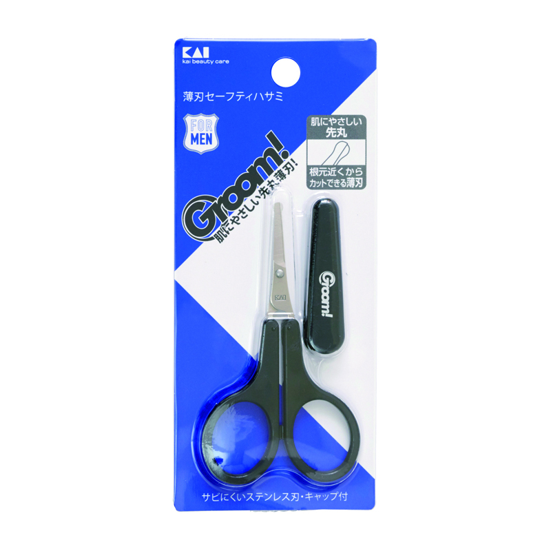 短いムダ毛もお手入れしやすい刃先の厚みが薄いタイプの日本製セーフティハサミ。鼻毛のお手入れに適した先丸加工を施しています。