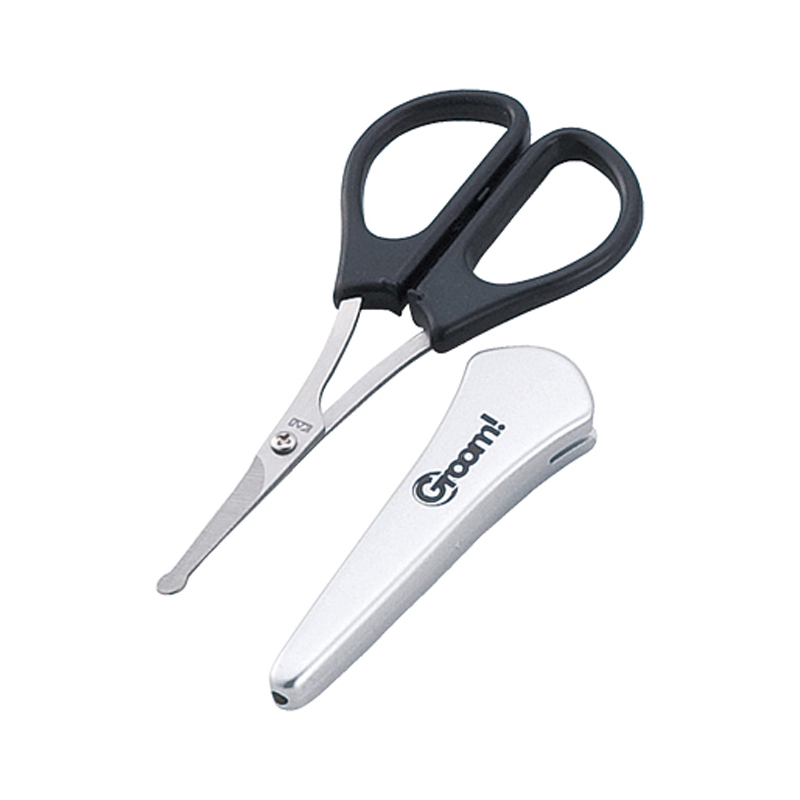 鼻のお手入れに適した、刃先が丸い安全設計です。サビにくいステンレス刃・安全キャップ付き。