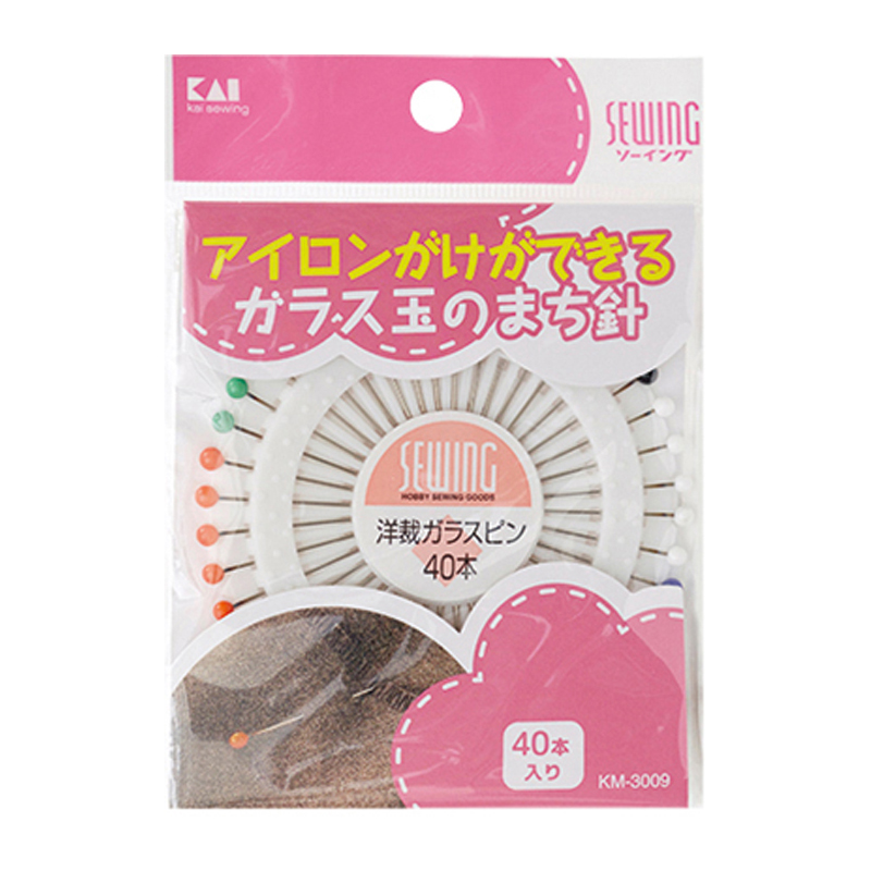 頭部にガラス玉を使用しているため、熱に強く、布に付けたままアイロンがけができる待針です。40本入り。