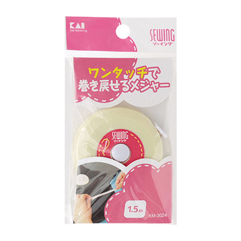 ワンタッチで巻き戻せるメジャーです。ガラス繊維を素材に使用しており伸び縮みが少なく巻きグセがつきにくいです。1,5m。