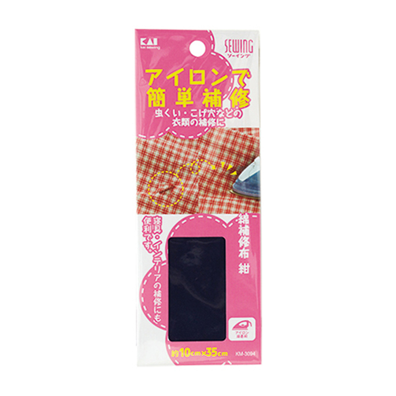 虫食い、こげ穴などの衣類の補修に。寝具やインテリアの補修にも便利な綿補修布紺。約10cm×35cm。