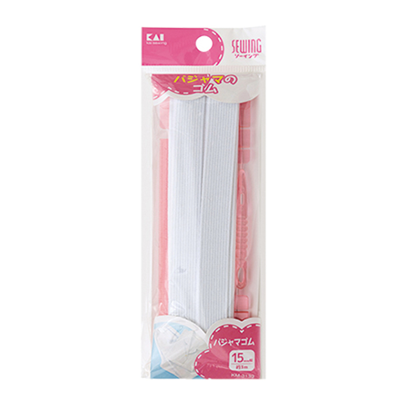 良質の天然ゴムと織糸で作られたゴムテープです。パジャマのゴムに。紐通し・定規付き。15mm幅×約3m。