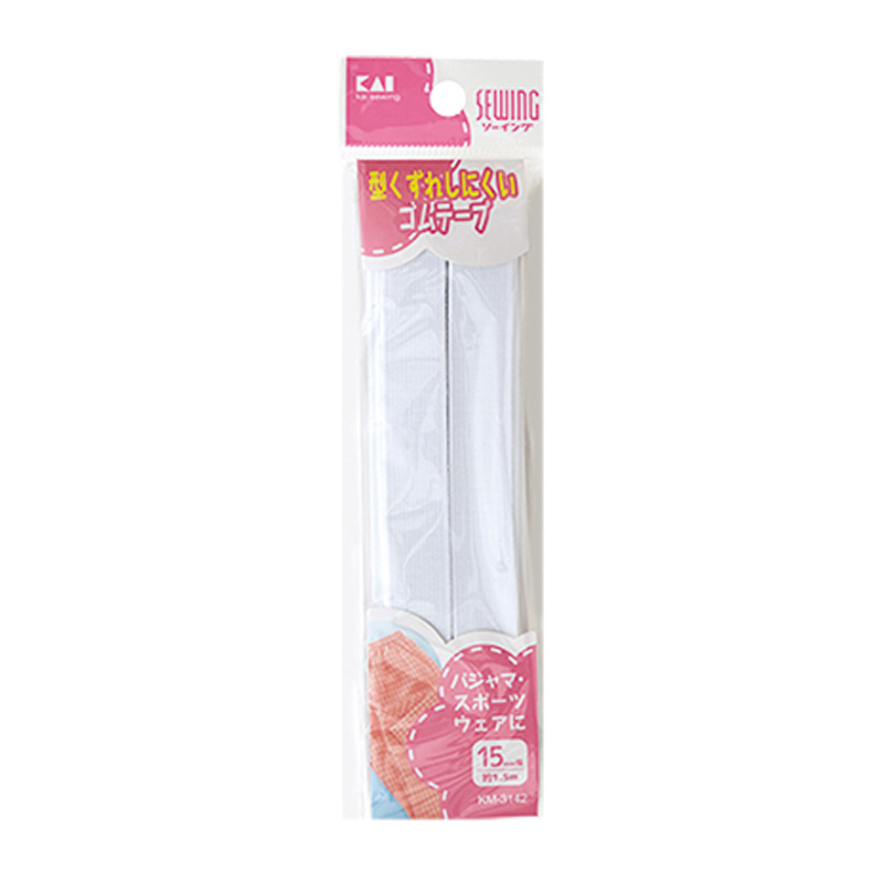 型崩れしにくいゴムテープ。スポーツウェア、パジャマ、スカート、スラックスなど様々な衣料に適しています。15mm幅×約1.5m。