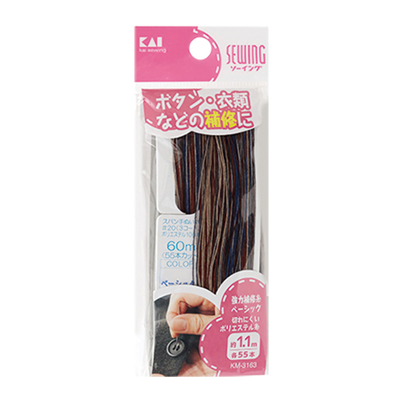 ボタン・衣料などの補修に。切れにくいポリエステル糸。1.1m、各55本。