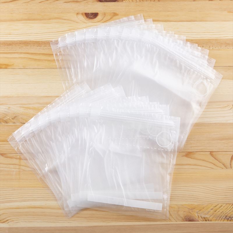 生鮮食品から乾物類まで、冷凍・冷蔵・常温と簡単操作で、幅広く使える真空保存袋です。専用の真空ポンプが付いた別売りの「真空保存袋スターターセット」とご一緒にお買い求めください。