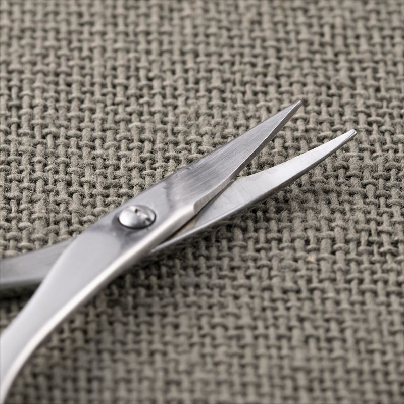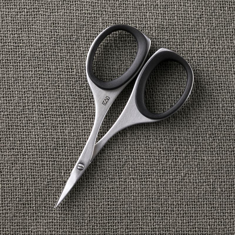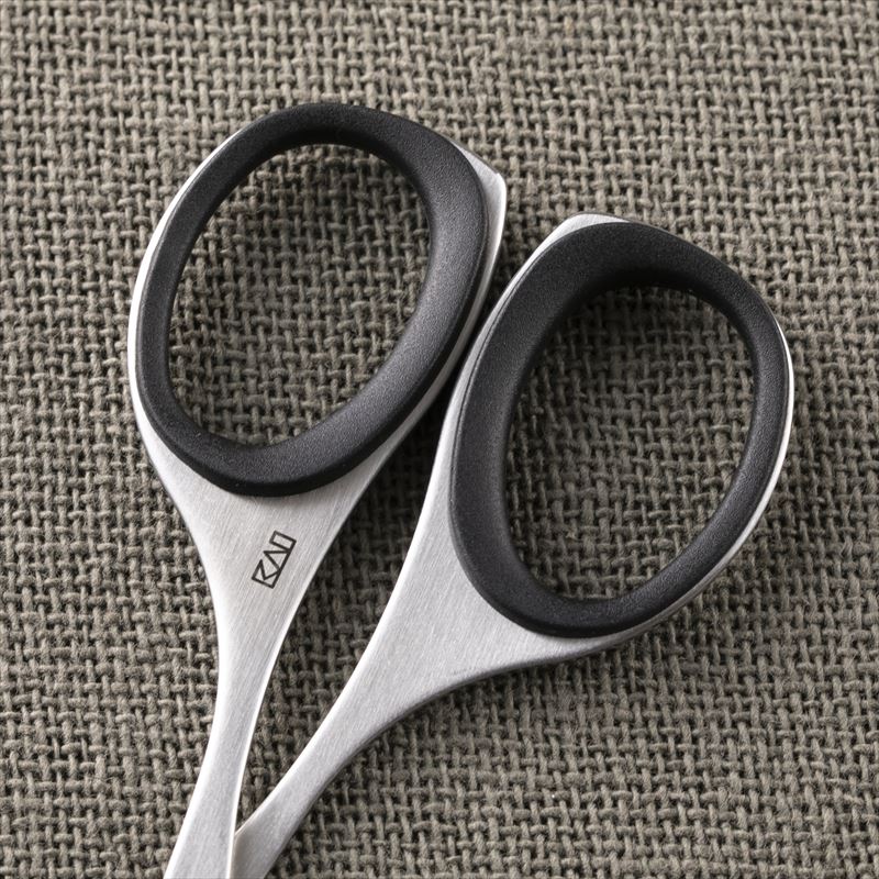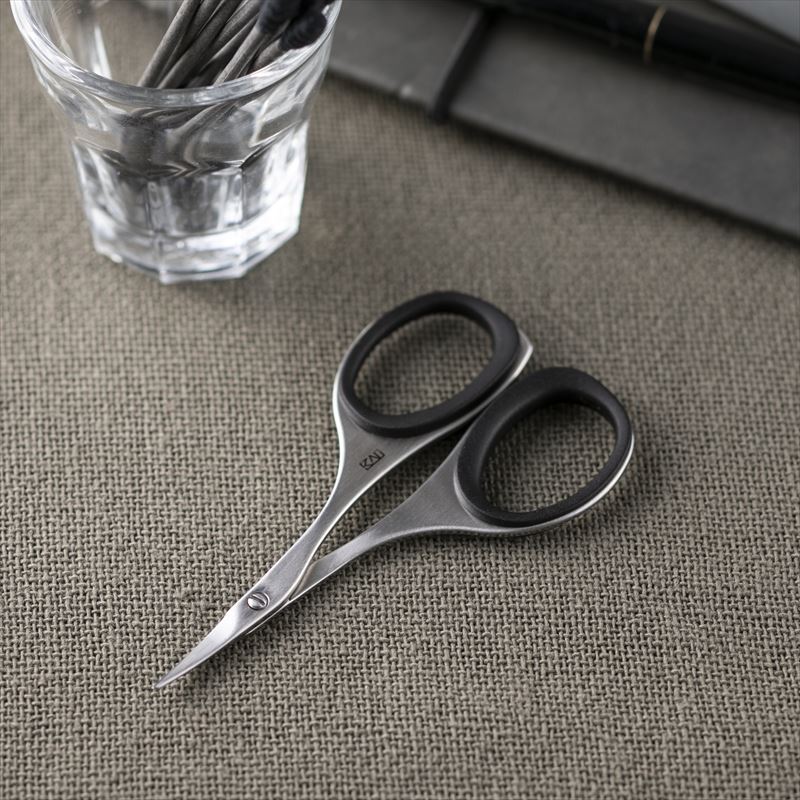 男性向けの指穴サイズで、すべりにくい樹脂リングを装着したオール金属の眉用ハサミです。