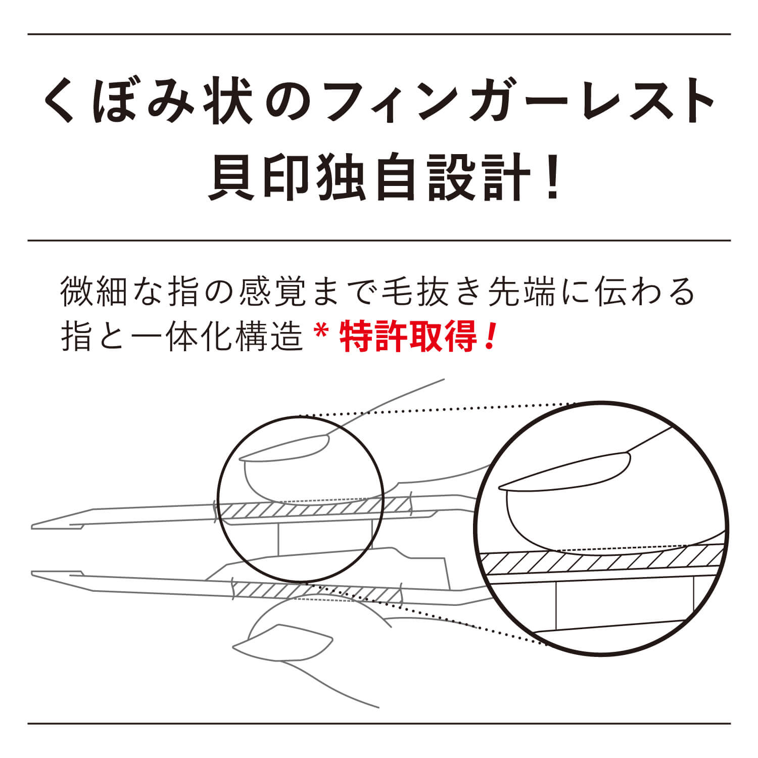 表面に凹みを設け、横ズレ防止部兼フィンガーレストとして繊細な操作がしやすい貝印独自の設計です。(特許取得)