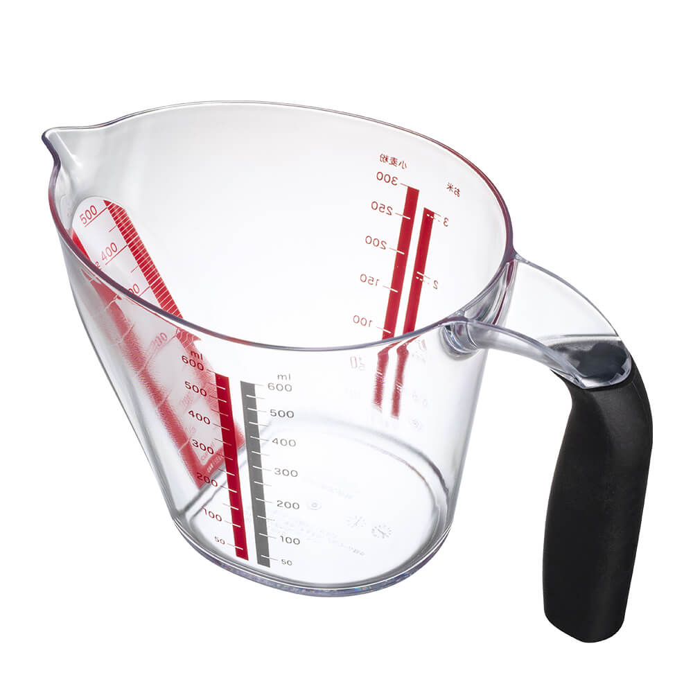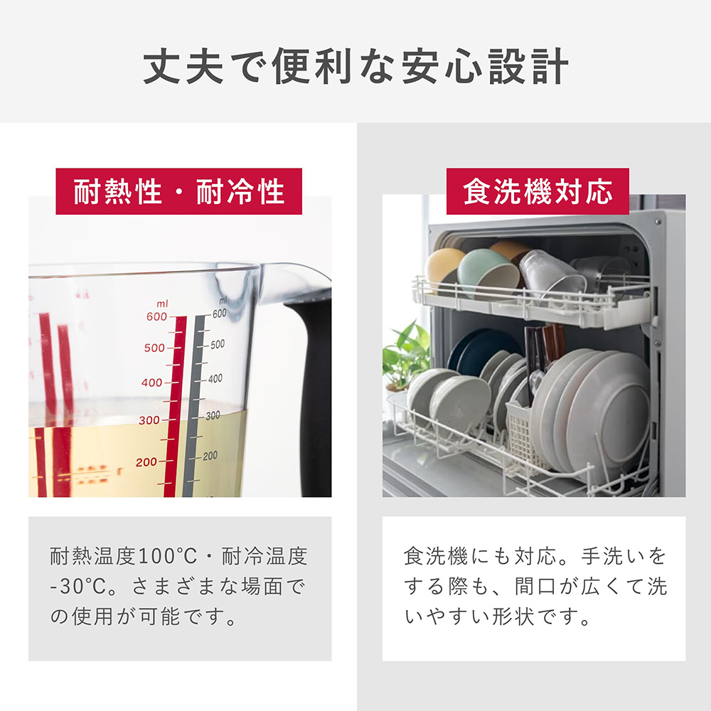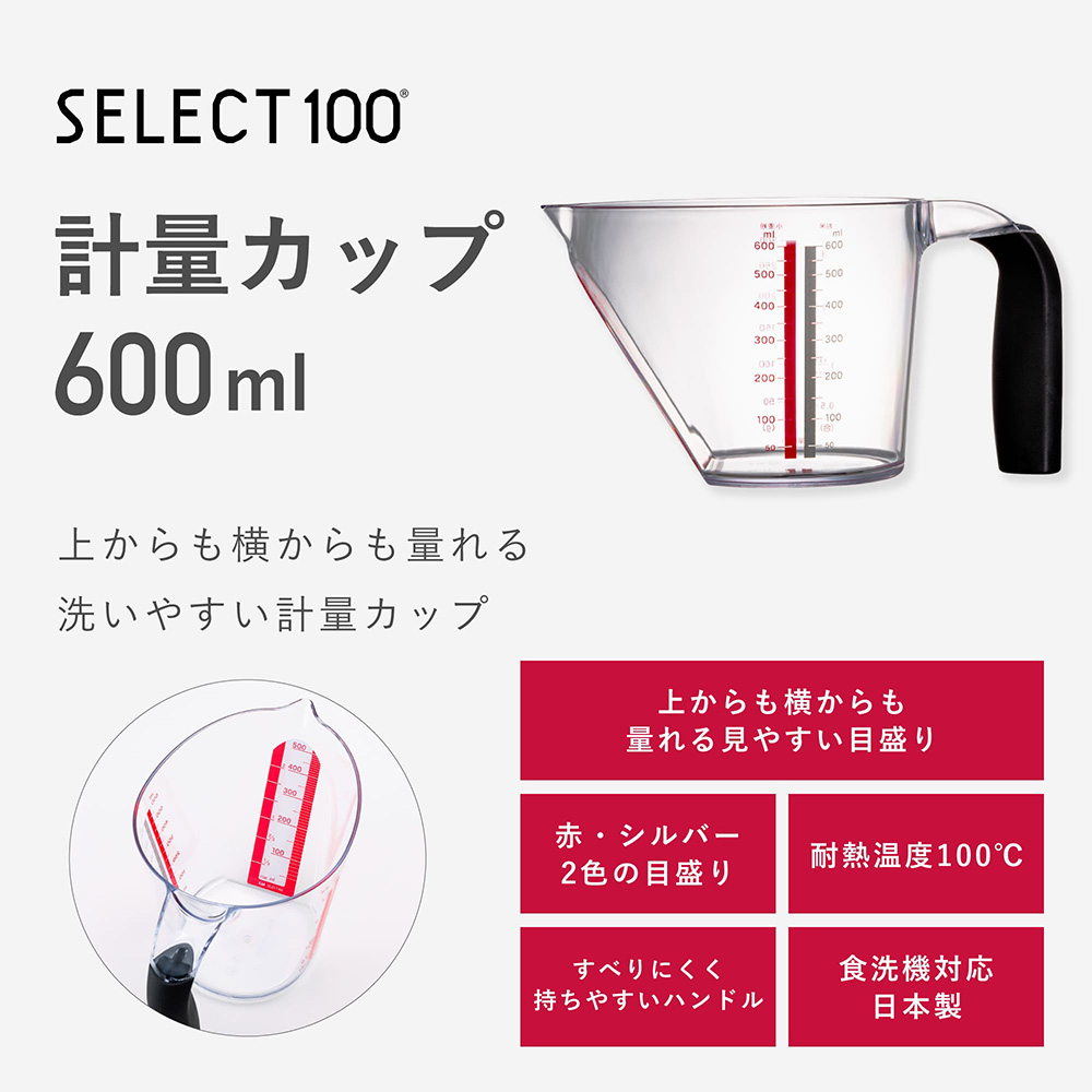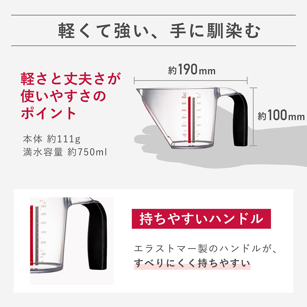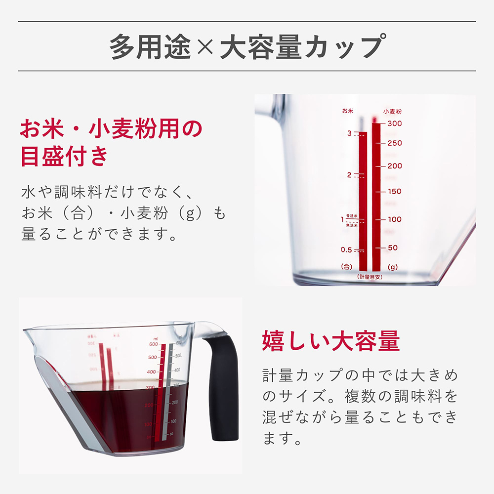 お米用の目盛は無洗米にも対応で、小麦粉用目盛付き。液体計量の目盛りは赤とシルバーの2色目盛でどんな調味料も見やすく量りやすくなりました。