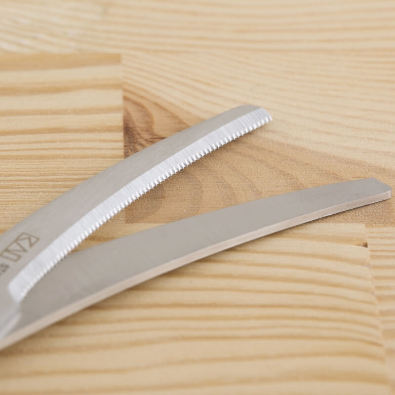 ・弓なりにカーブした形状とギザ刃で食材を逃がさずしっかりつかみます。