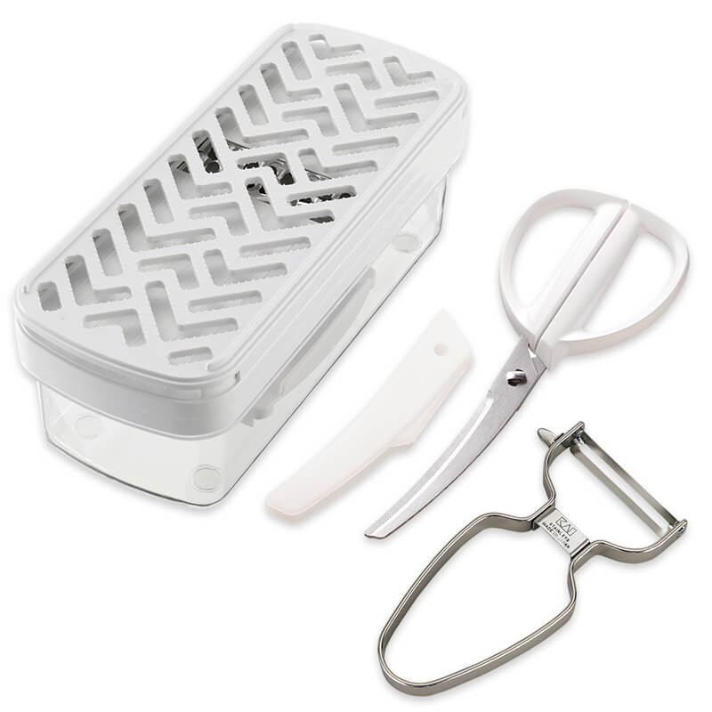 1台4役の「調理器セット」、丈夫で衛生的な「ステンレス製のピーラー」、分解洗浄できる「カーブキッチンハサミ」が全てセットになっています。