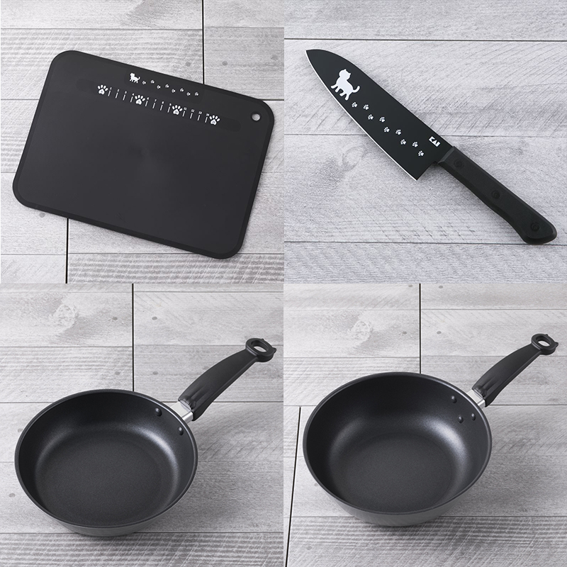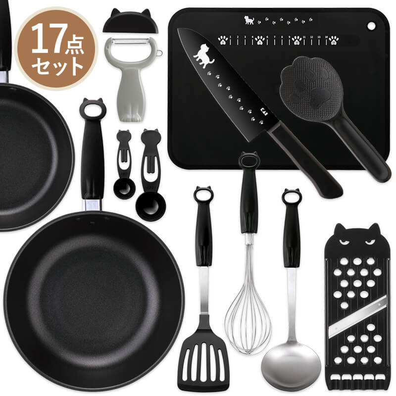 - “ねこと一緒に楽しくお料理!”当社売れ筋商品の性能を活かしつつ、キッチンの雰囲気を邪魔しない形でネコモチーフを取り入れました。ネコ好きの方もそうでない方も『欲しい!使いたい!』と思える、ほどよいネコ感を大切にしています。Nyammyシリーズのねこ包丁(三徳165mm)やフライパン2種を含む、豪華17点のスターターセットです。自宅用はもちろん、これから料理を始める方や一人暮らしの方、ネコ好きのご家族・ご友人への贈り物にもどうぞ♪