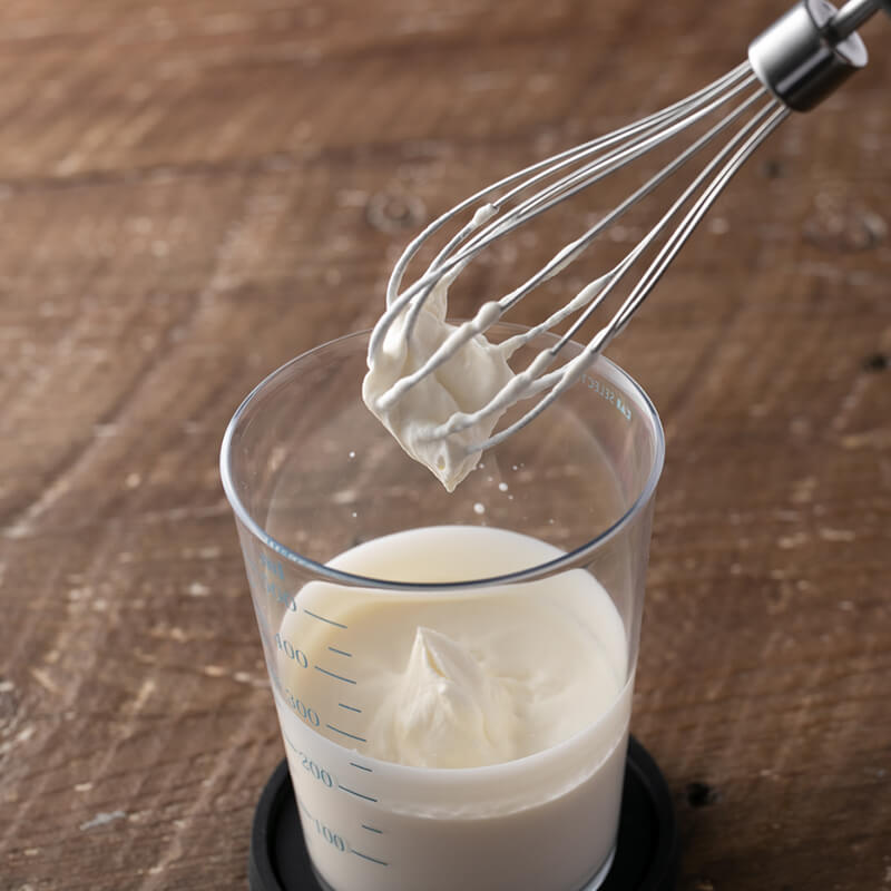 大きなウィスクはメレンゲやクリーム作りにぴったり!小さなウィスクは200mlの計量カップにも入るサイズで少量泡立てや料理に便利です。