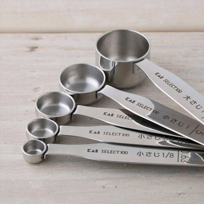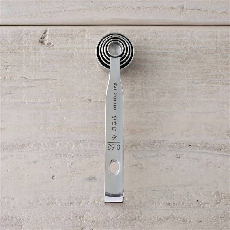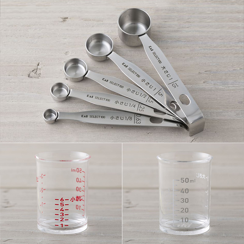 計量スプーンは、大さじ1・小さじ1・小さじ1/2・小さじ1/4・(ひとつまみ)・小さじ1/8(少々)の5本組。置いたままでも計量可能、5本まとめてスタッキング収納が出来ます。計量カップは、少量の調味料計りに便利。透明液が見やすい赤の目盛と、醤油など濃い色の液が見やすいシルバーの目盛タイプの2個セットです。それぞれのカップには、「ml」「大さじ」「小さじ」の3種の単位の目盛りがついています。