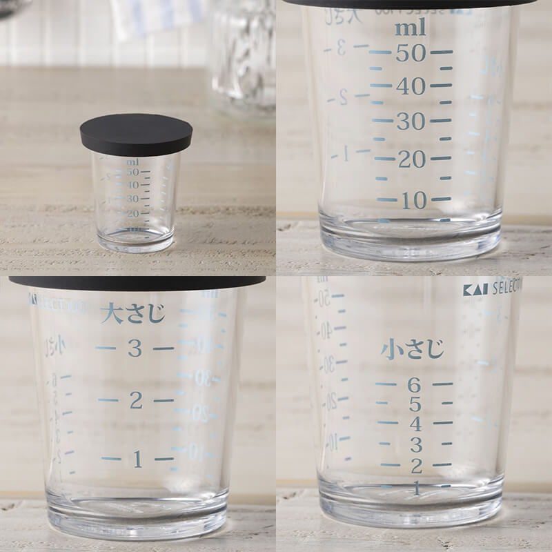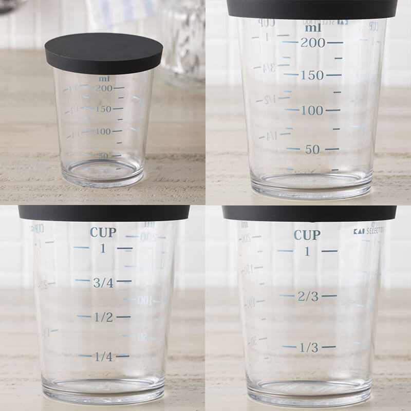透明色・濃い色など問わず、全調味料が見やすいカラー目盛りの計量カップ。一時置きや重ね置きに便利なフタ付きで、3サイズを重ねてコンパクトに収納できます。