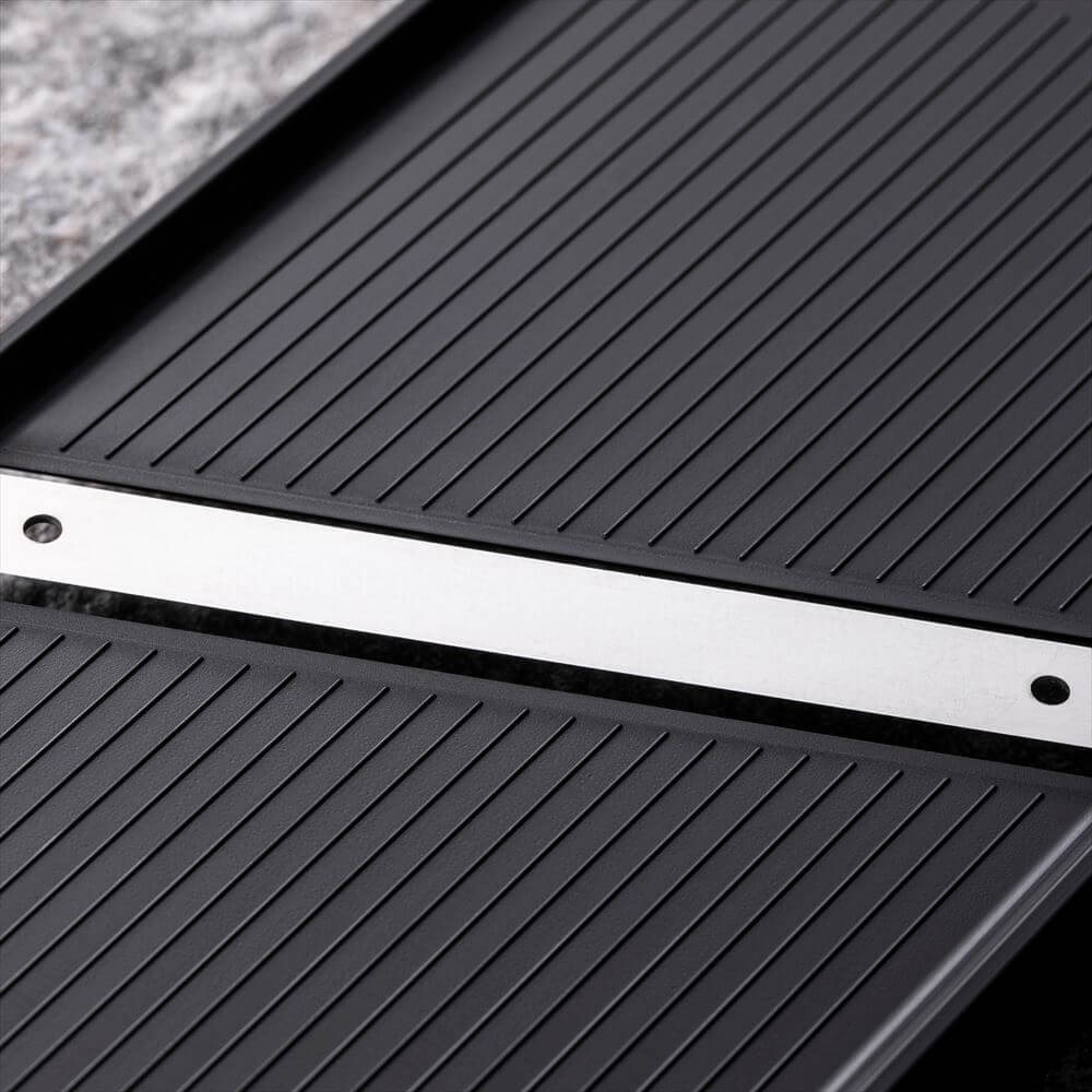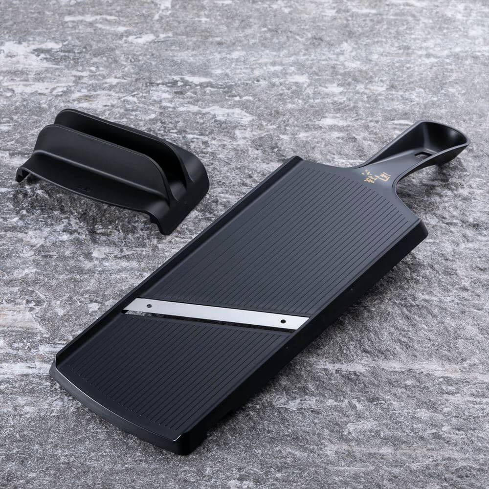 スピーディーにスライスできる両刃仕様。握りやすいハンドル形状。安全に使える指ガード付き。食器洗浄機使用可