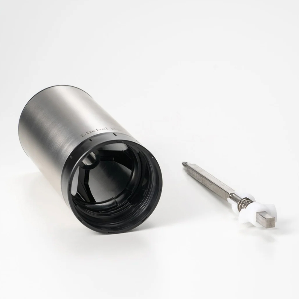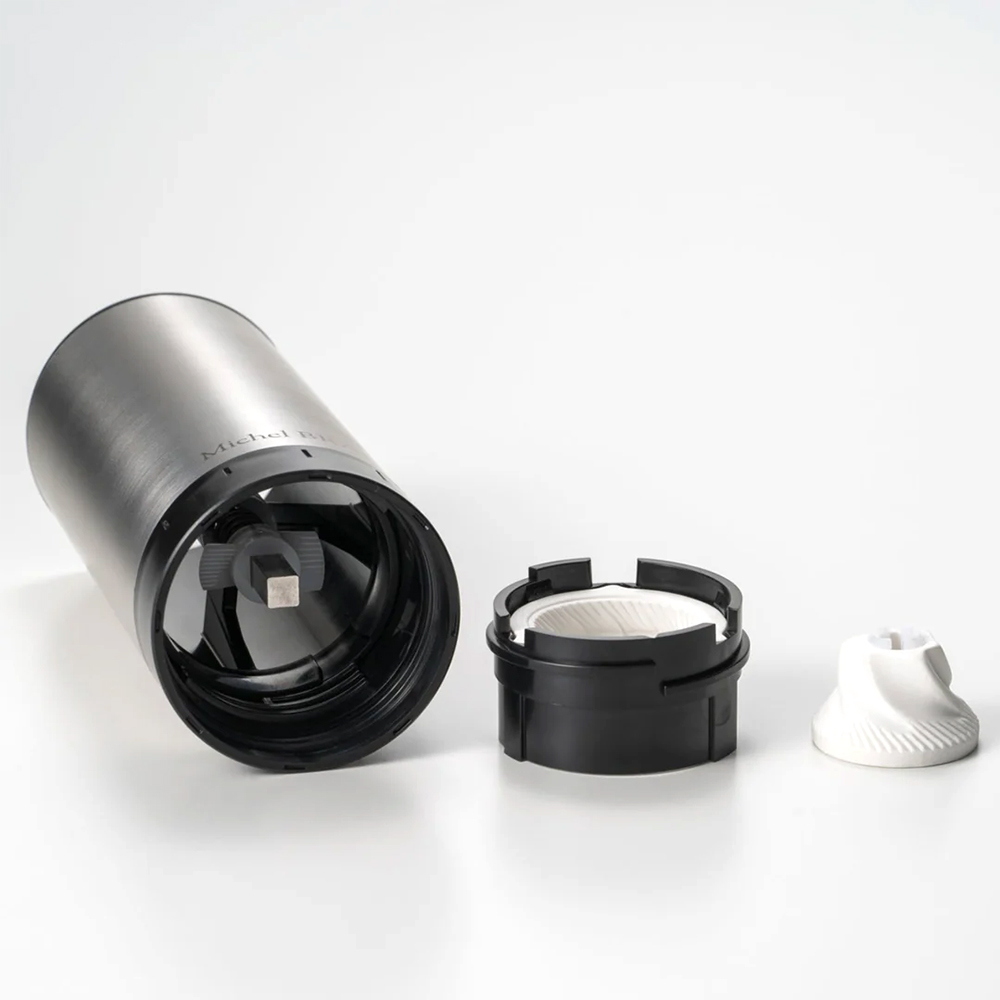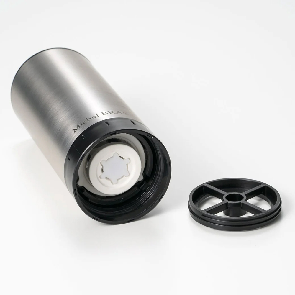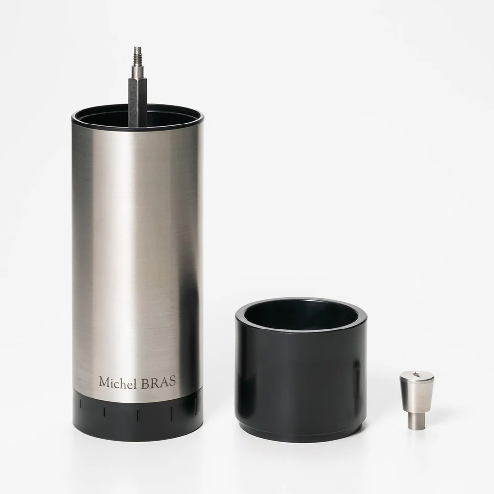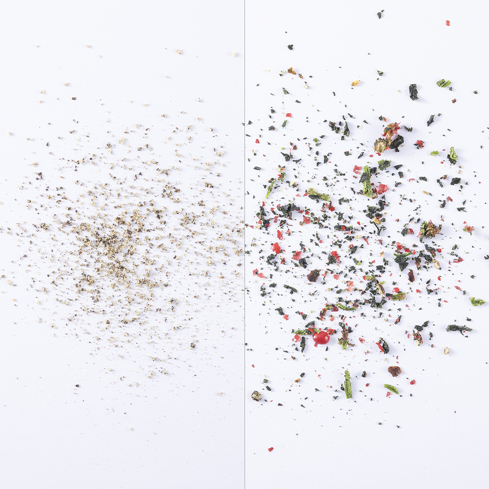 - さまざまな食材を繊細に粉砕して、新しい食感と仕上がりを多様な食材を粉砕する「Le Moulin ル・ムラン」。スパイスやハーブから、乾燥させたキノコや野菜、砕いたコーヒー豆などまで、硬い食材のみならず、ややソフトなものにも的確に対応します。鋭く繊細な切れ味の刃が、バランス良く押し出される食材をしっかりとらえて粉砕。また、粒度調節リングを回転させることで、粉砕する食材の粒度を9段階という細かさで設定できます。