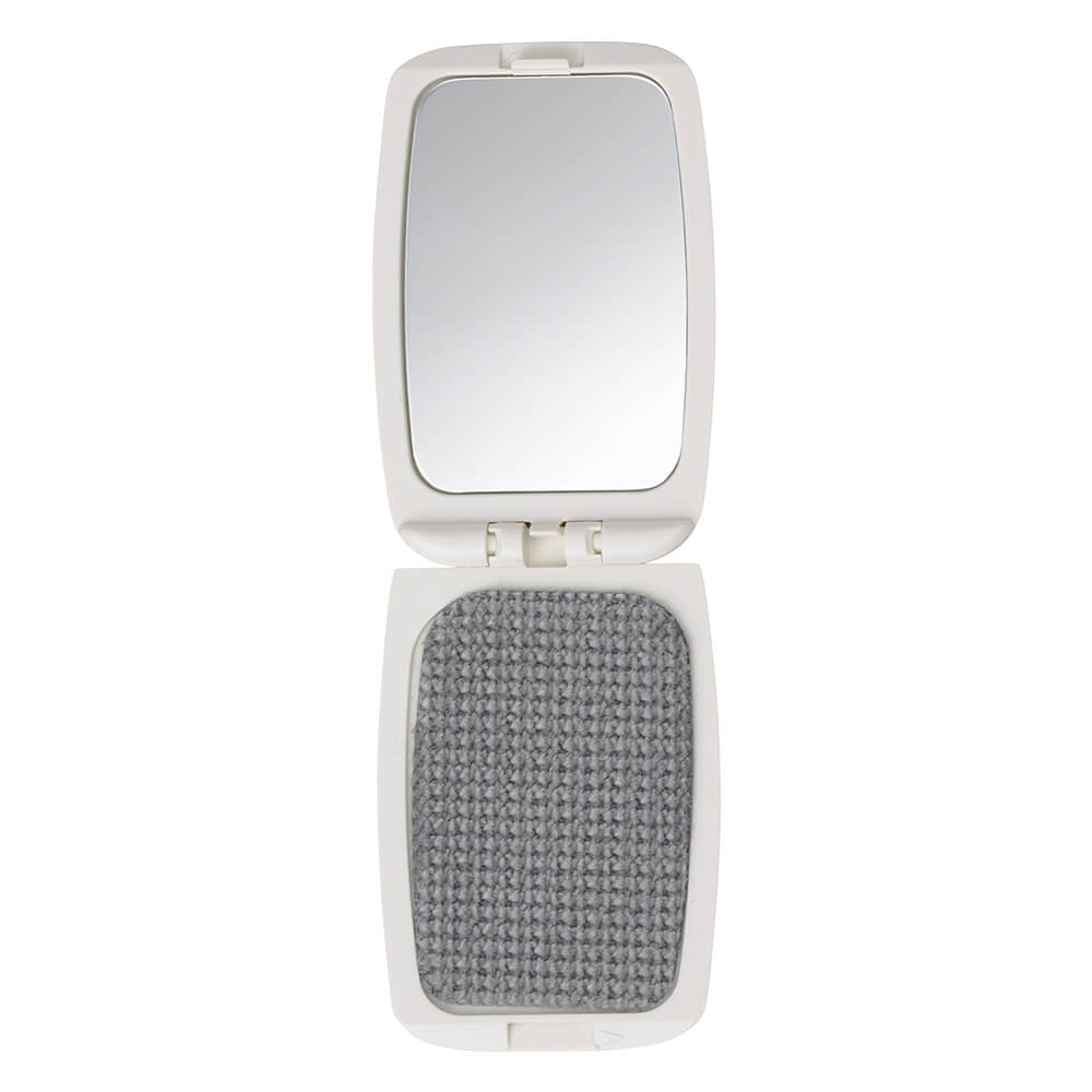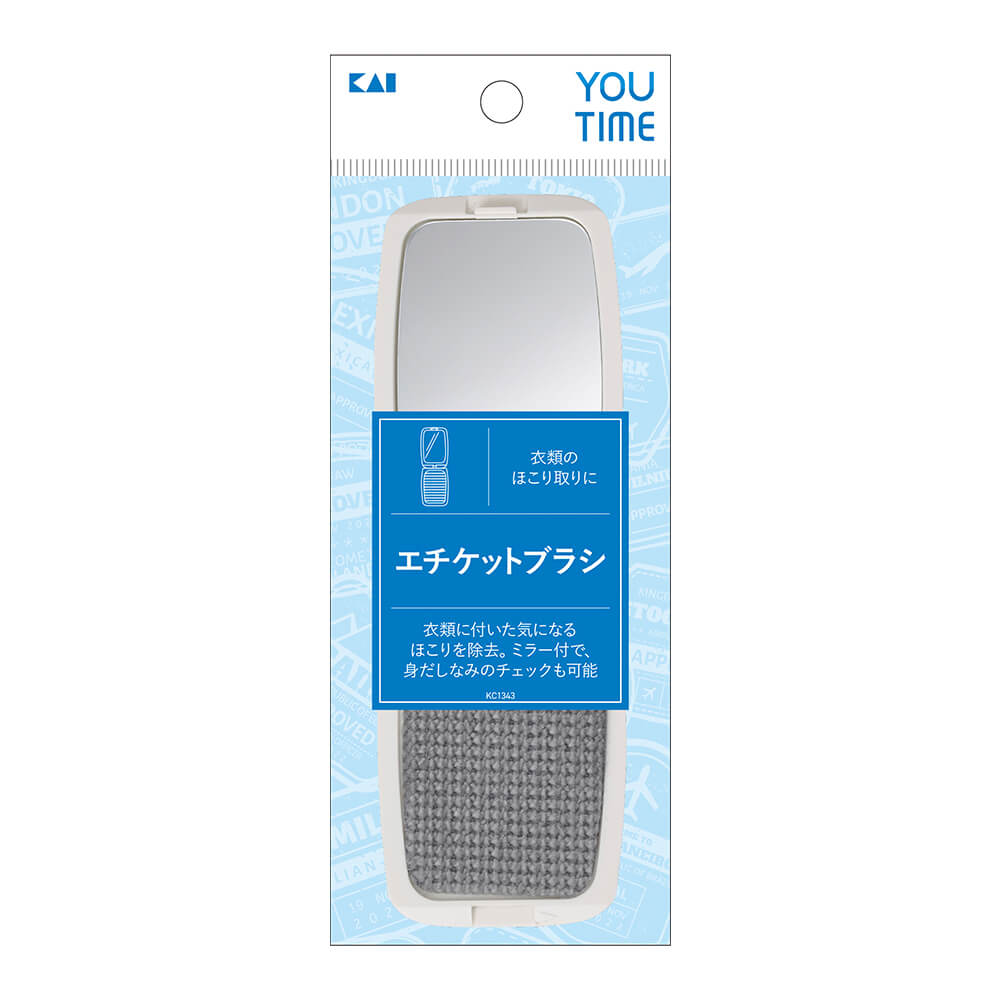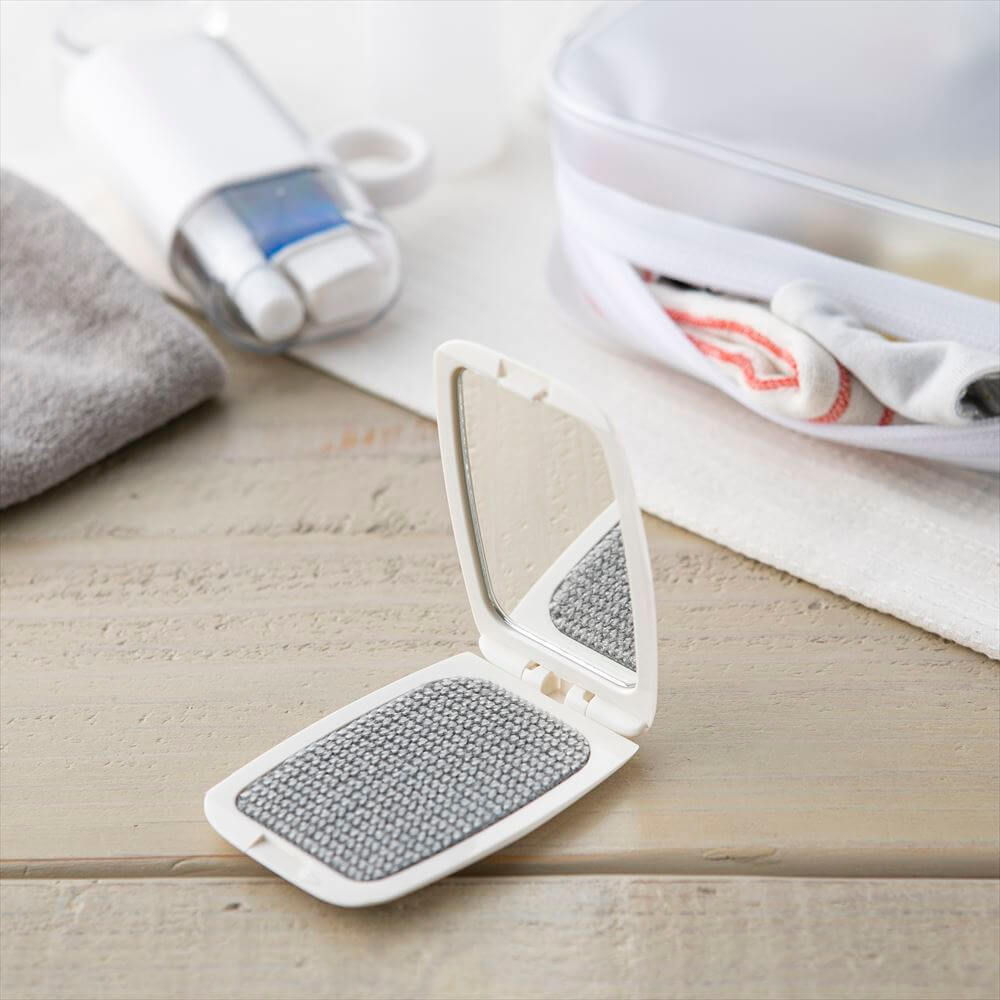衣類のほこり取りに便利な、エチケットブラシです。衣類に付いた気になるほこりを除去。ミラー付で、身だしなみのチェックも可能。
