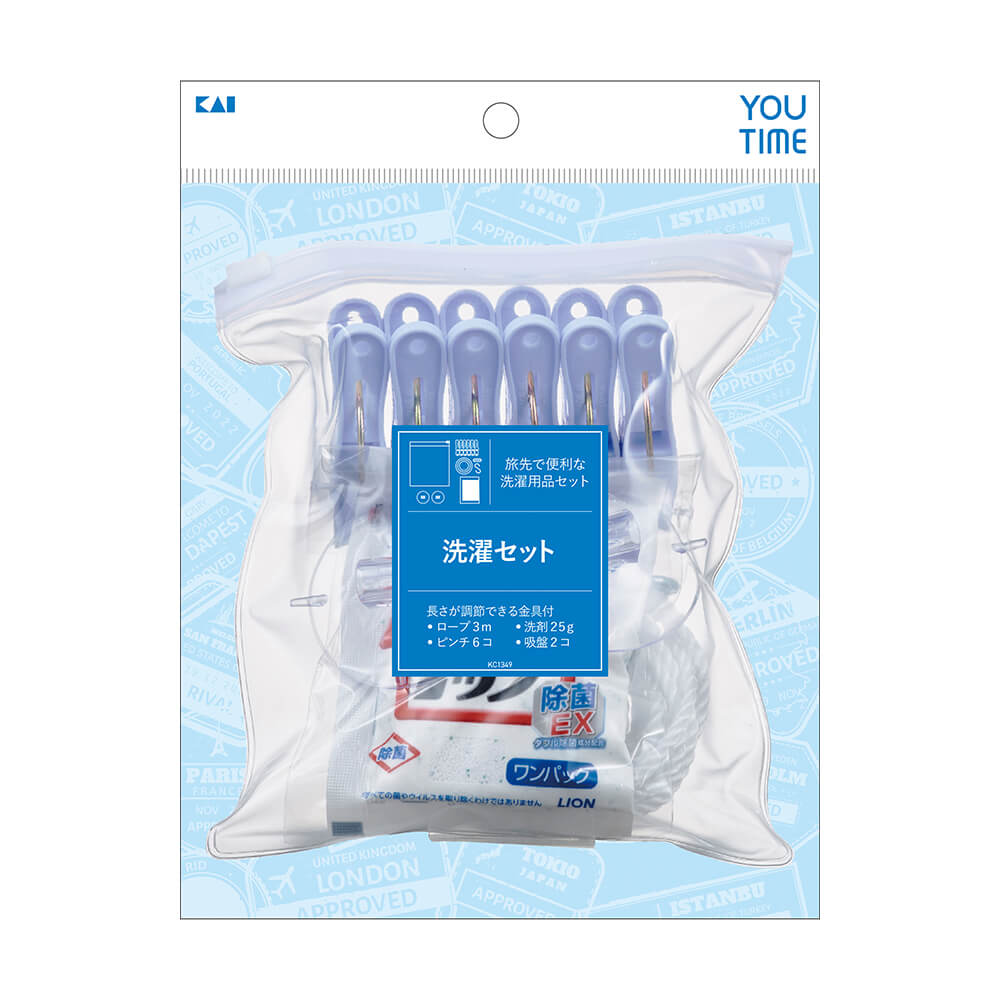 旅先で便利な洗濯用品セット。長さが調節できる金具付。