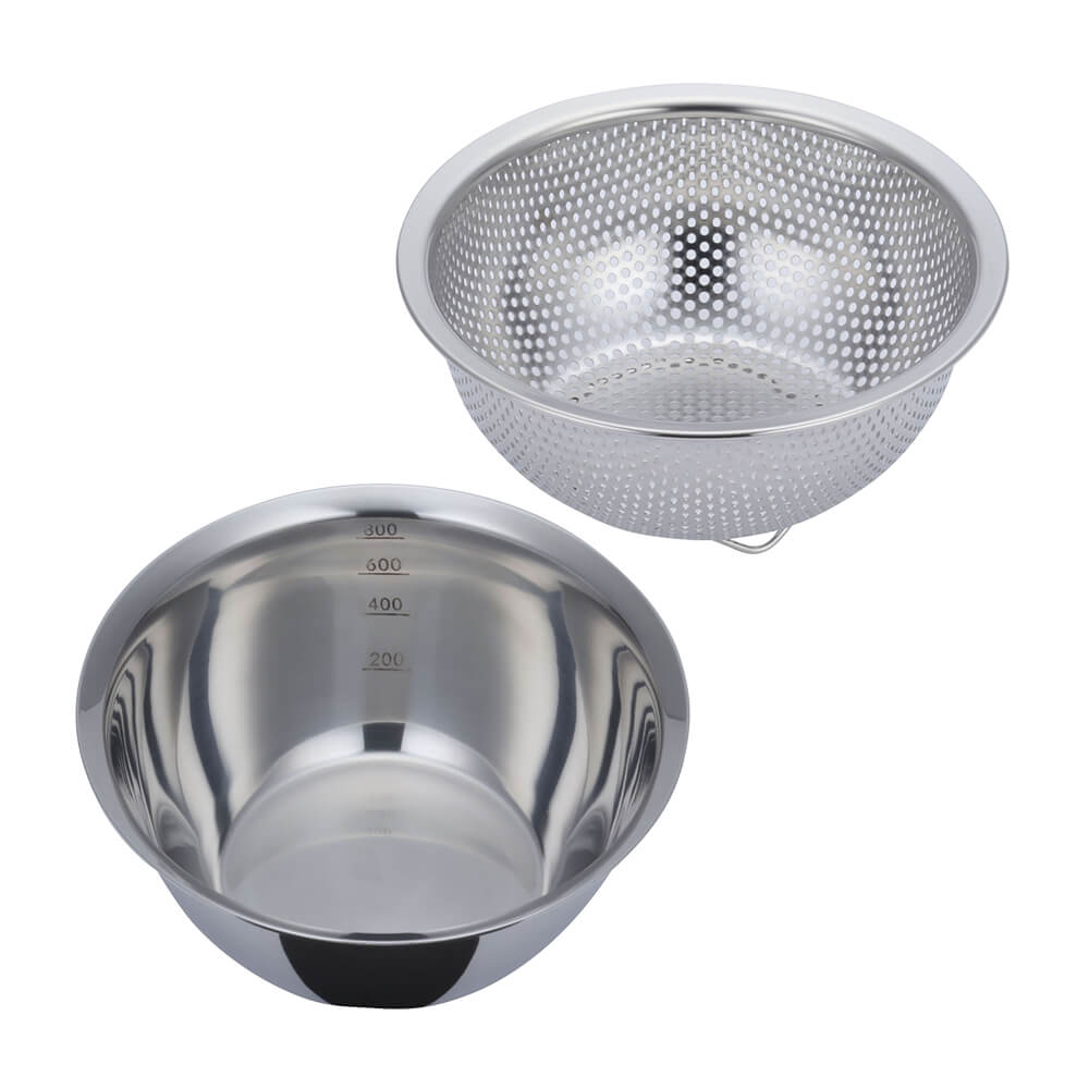 シンプルで、清潔なステンレスボウルとザルのお買い得な2点セットです。重ねて使え、収納時はきれいに2点が重なるので 使い勝手も収納もバッチリ!軽くて普段使いにオススメのセットです。毎日の料理に多用途で使え、重宝すること間違いなし。