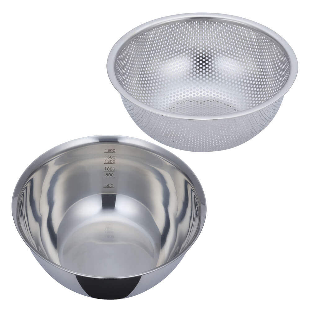 シンプルで、清潔なステンレスボウルとザルのお買い得な2点セットです。重ねて使え、収納時はきれいに2点が重なるので 使い勝手も収納もバッチリ!軽くて普段使いにオススメのセットです。毎日の料理に多用途で使え、重宝すること間違いなし。