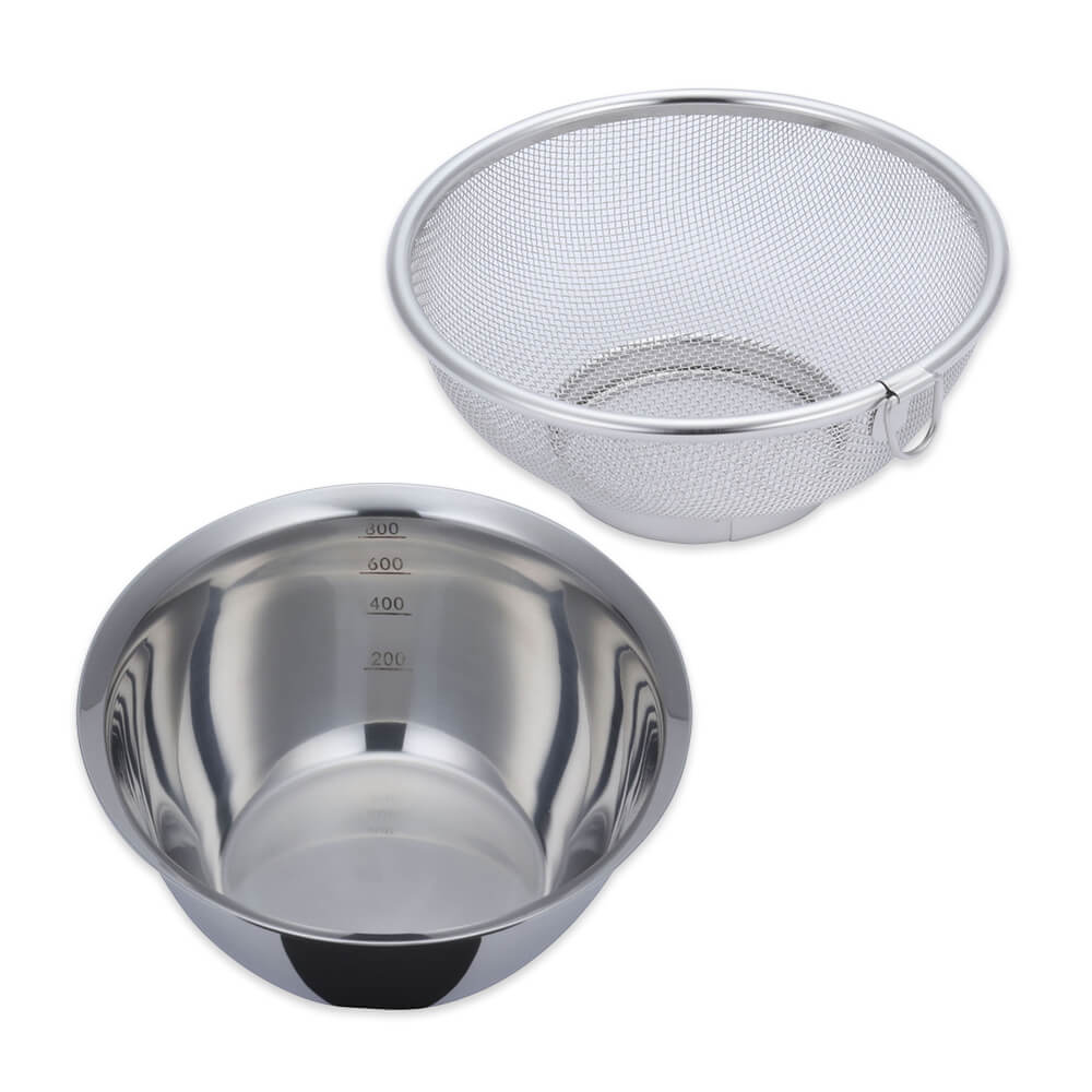 シンプルで、清潔なステンレスボウルとザルのお買い得な2点セットです。重ねて使え、収納時はきれいに2点が重なるので 使い勝手も収納もバッチリ!軽くて普段使いにオススメのセットです。毎日の料理に多用途で使え、重宝すること間違いなし。