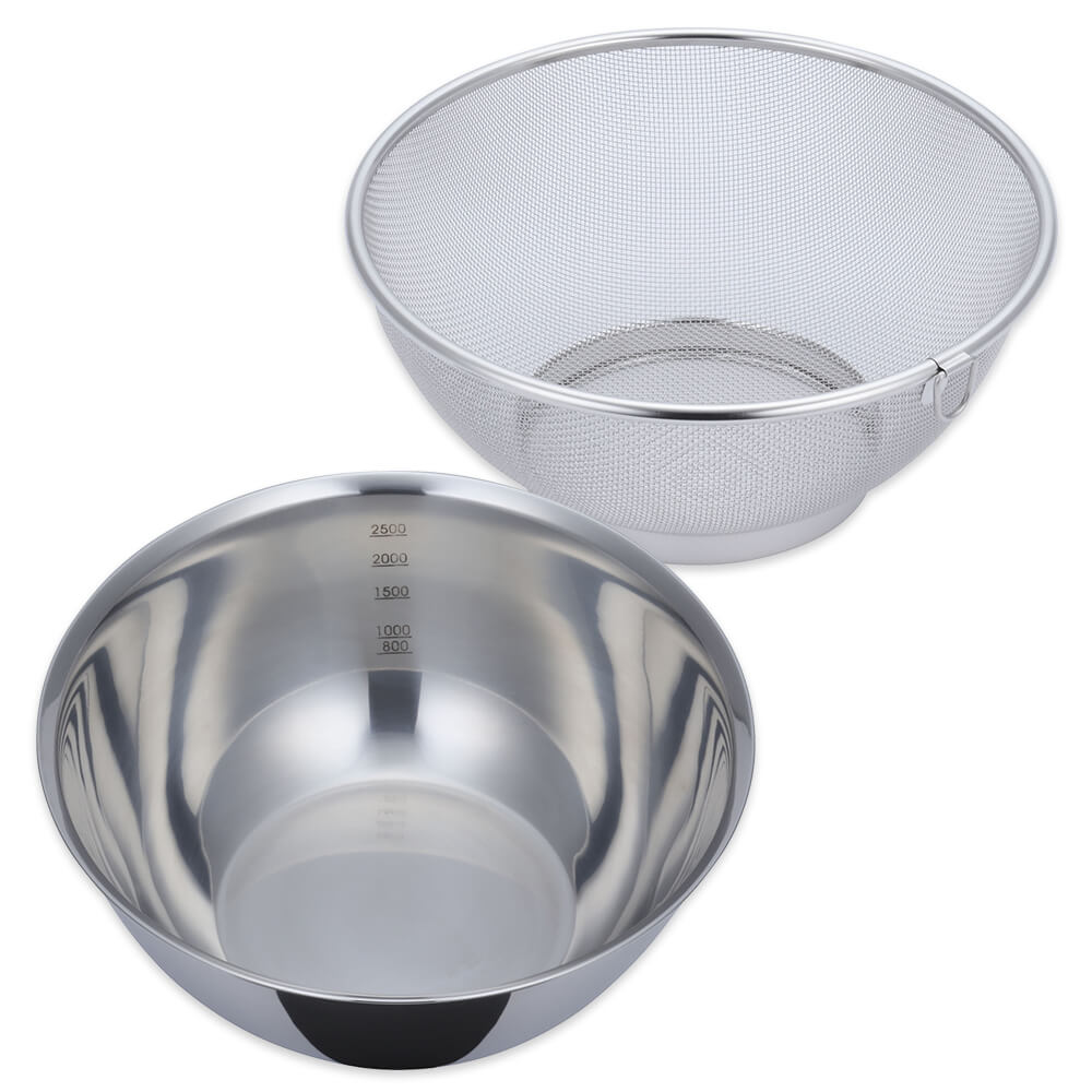 シンプルで、清潔なステンレスボウルとメッシュボウルのお買い得な2点セットです。重ねて使え、収納時はきれいに2点が重なるので 使い勝手も収納もバッチリ!軽くて普段使いにオススメのセットです。毎日の料理に多用途で使え、重宝すること間違いなし。