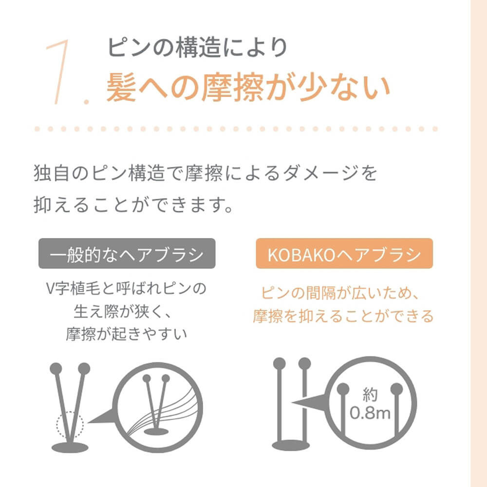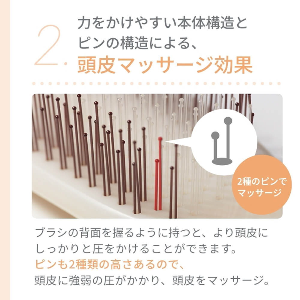 やさしい肌あたりを考えて、やわらかめのピンとかためのピンを配列。プロテクションピン™を採用して、ピンとピンの間隔があることで髪の摩擦が少なく、櫛通りがなめらかです。ピンの先は球状で頭皮を傷つけにくく、心地よく頭皮に刺激を与えます。
