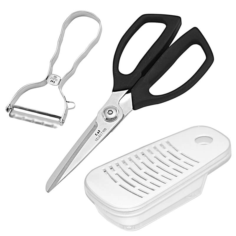 雑誌「MONOQLO」にてベストバイ商品として選ばれた、おろし専科・SELECT100ピーラー/キッチンばさみを集めた3点セットです。