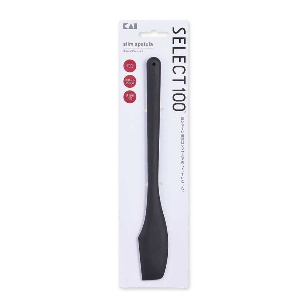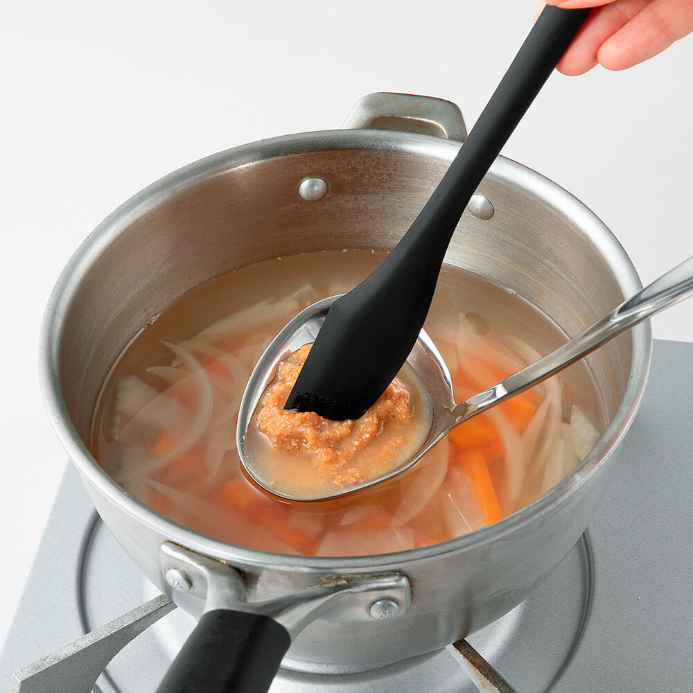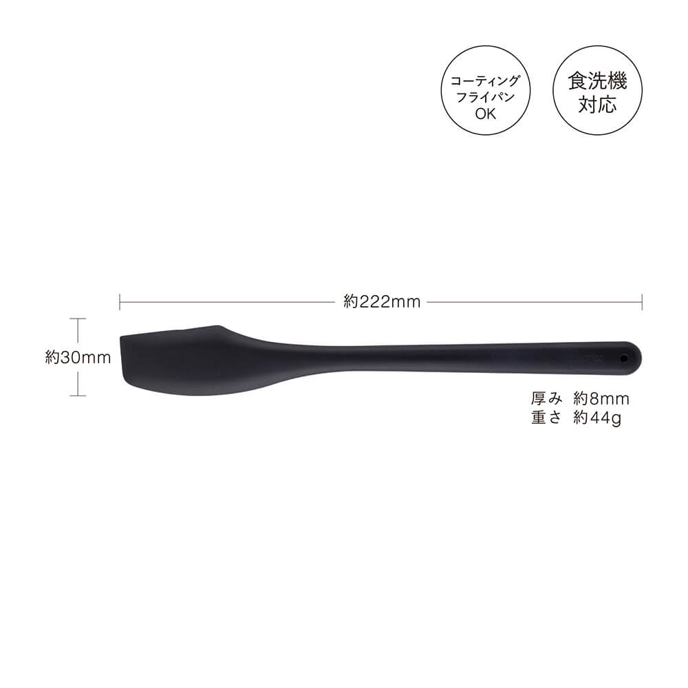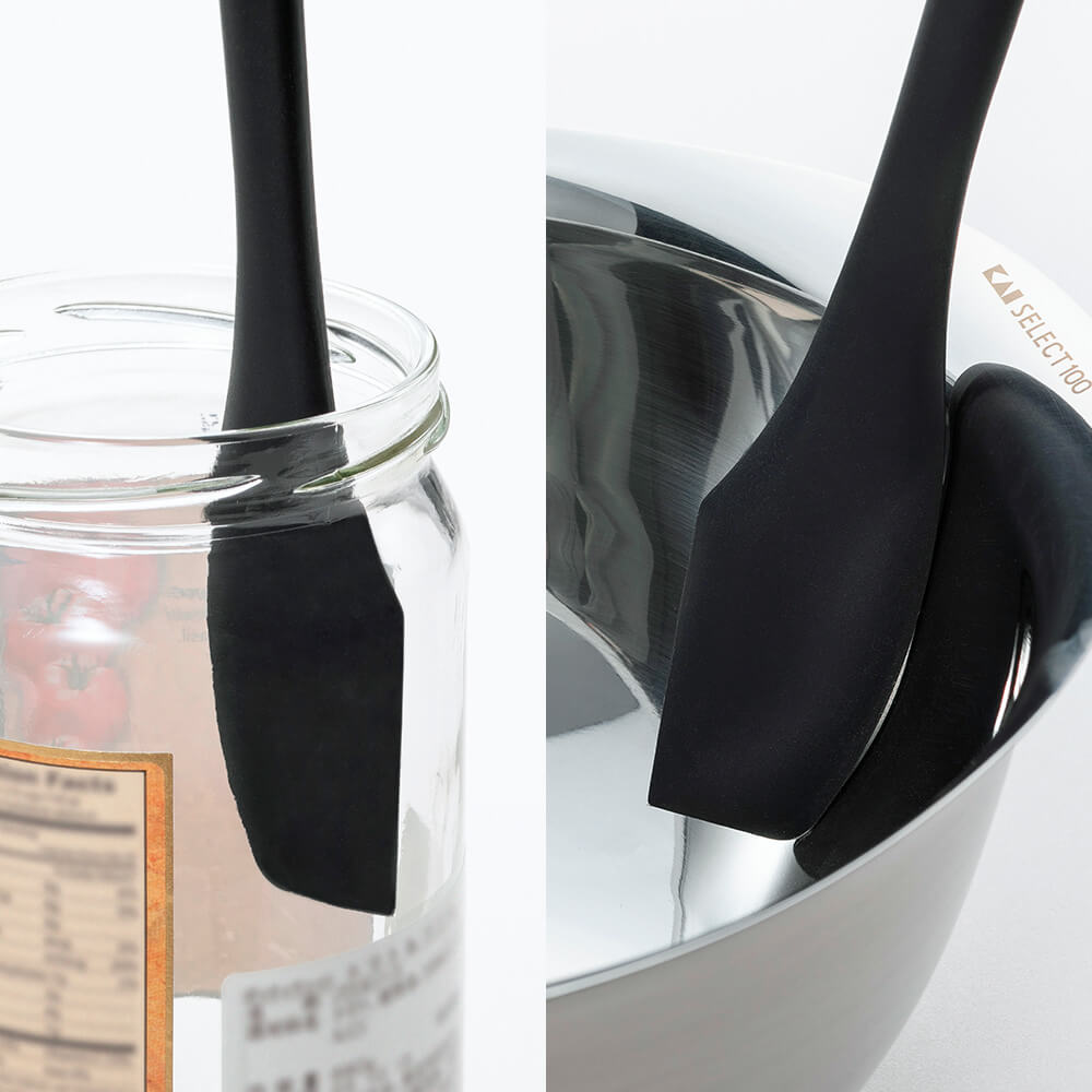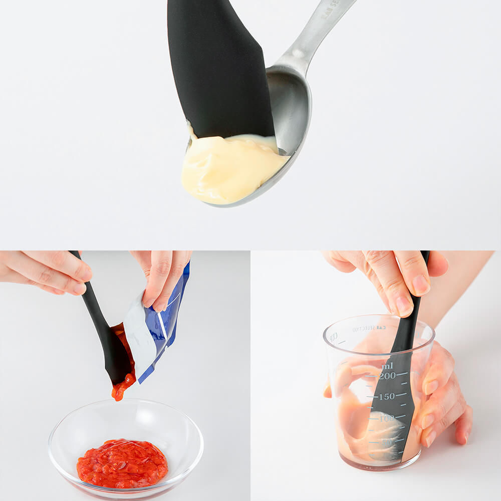 ジャム瓶や味噌パックからの取り出し、小さめのボウルや計量カップなどにもフィットする、スリムなシリコーンベラです。