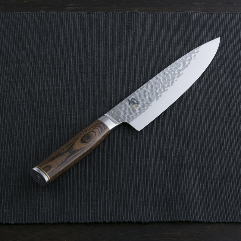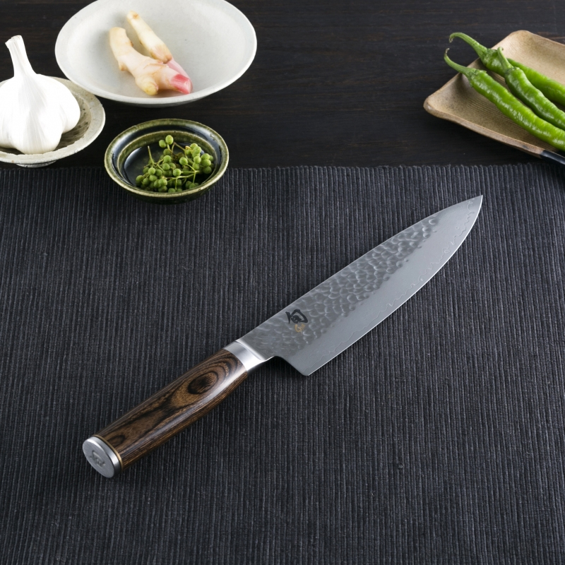 刃全体に槌目加工を施すことにより、ダマスカス模様と槌目の織り成すデザインが特徴です。刃には高硬度でかつ靱性を併せ持つVG-MAXダマスカス材を使用し、鋭い切れ味を実現しています。また、ハンドルは、積層強化木を使用した、オーバルハンドル形状を採用し、柔らかな握り心地を追及しています。