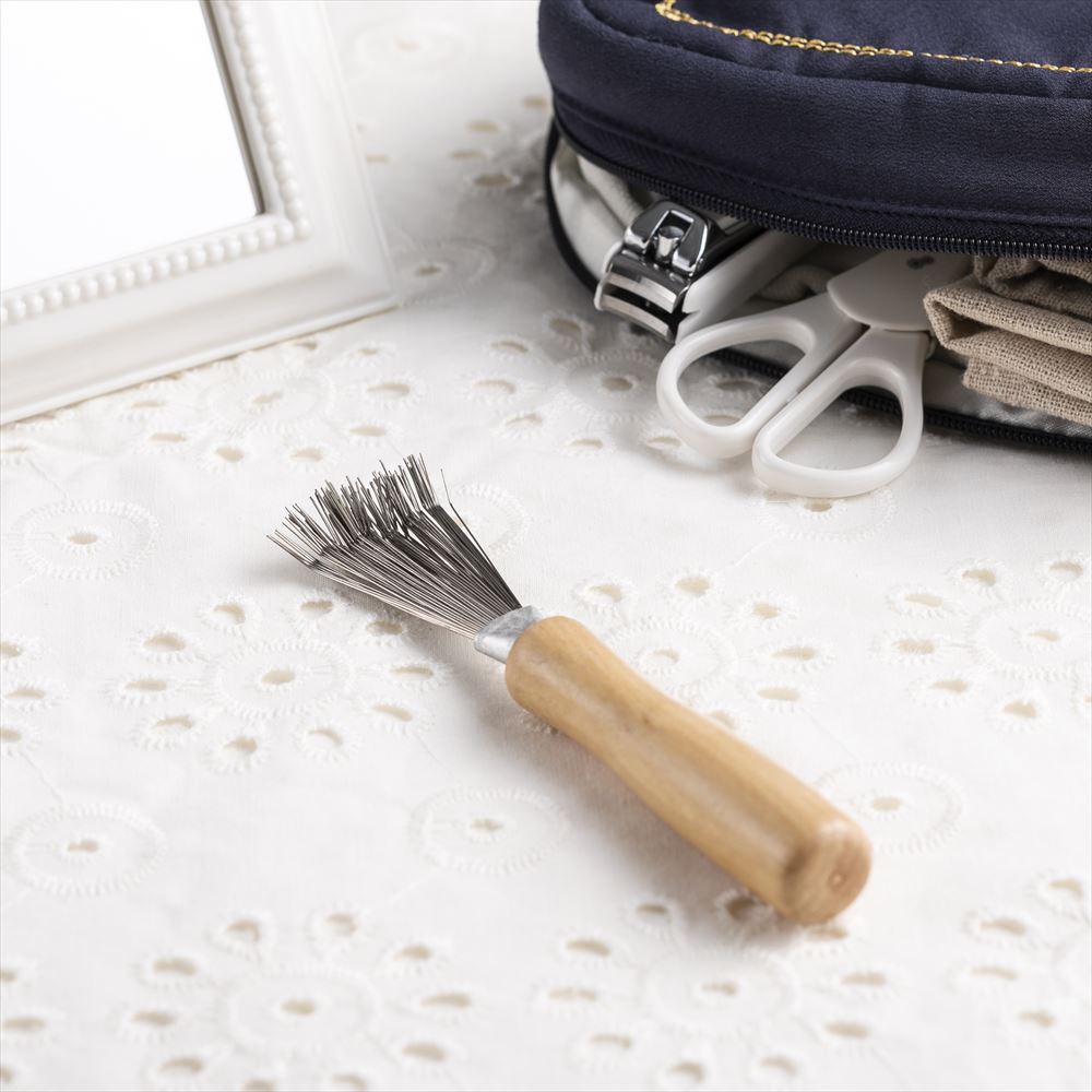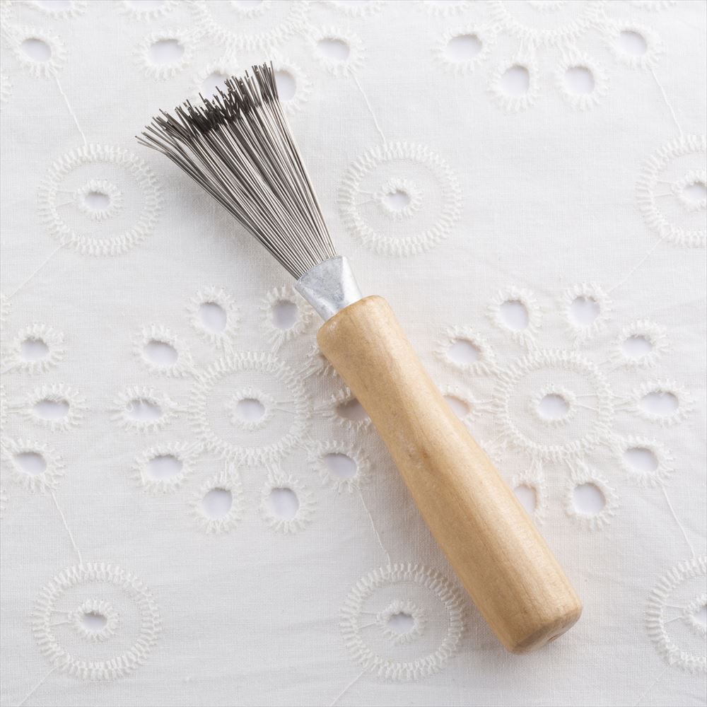 金属製のブラシをくまで型に植え込むことで、細い毛のブラシに絡まった髪の毛やホコリを簡単にかきとることができる。