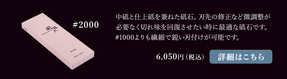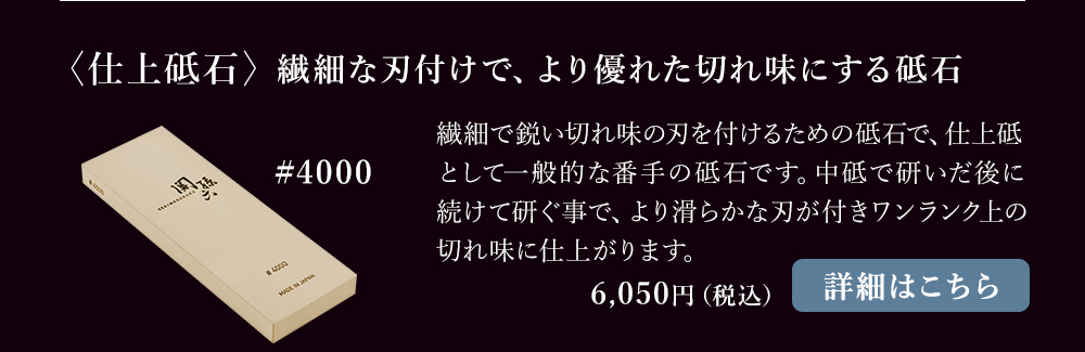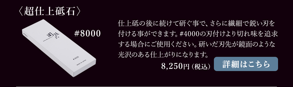 仕上砥の後に続けて研ぐ事で、さらに繊細で鋭い刃を付ける事ができます。#4000の刃付けより切れ味を追求する場合にご使用ください。研いだ刃先が鏡面のような光沢のある仕上がりになります。