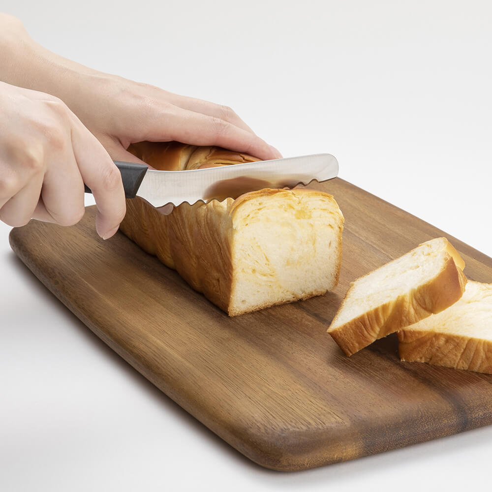 パンやパウンドケーキの切り分けに便利な波刃タイプのブレッドナイフ。