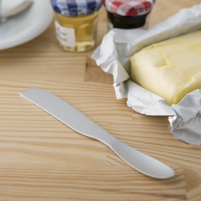 ステンレスの約12倍の熱伝導効率を持つアルミニウム素材で、冷蔵庫から出したてのカチカチバターもしっかりすくえます。