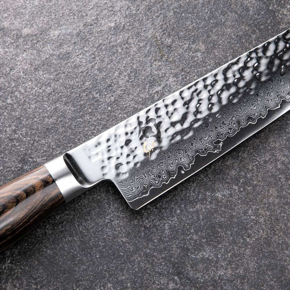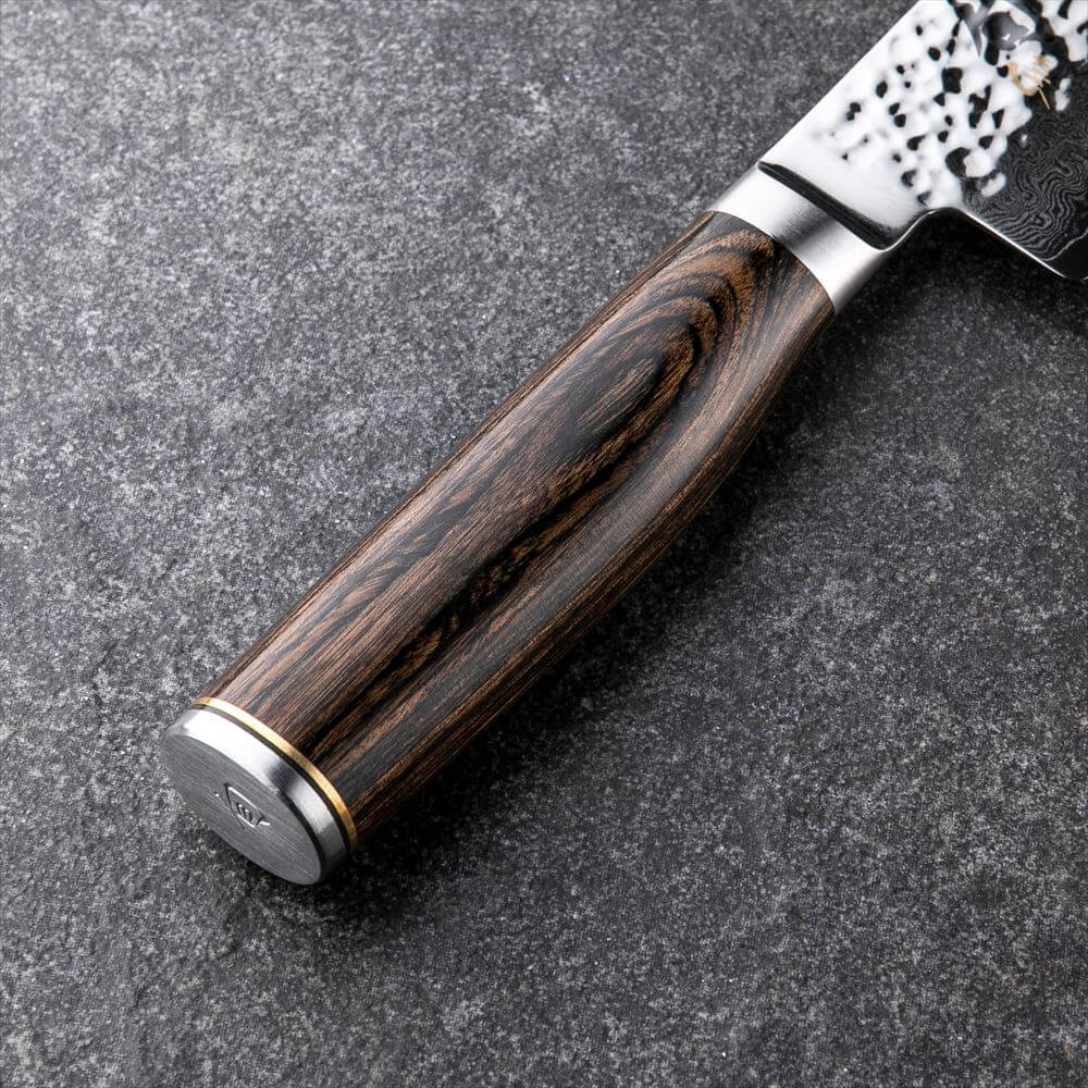 刃全体に槌目加工を施すことにより、ダマスカス模様と槌目の織り成すデザインが特徴です。刃には高硬度でかつ靱性を併せ持つVG-MAXダマスカス材を使用し、鋭い切れ味を実現しています。また、ハンドルは、積層強化木を使用した、オーバルハンドル形状を採用し、柔らかな握り心地を追及しています。