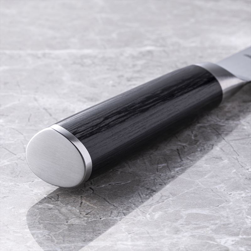 - 野菜、魚介、肉、いずれの素材も軽快に切ることができます。包丁のアゴの部分を使えば、ジャガイモの芽など、素材の要らない部分を取り除く作業も可能。毎日の基本的な調理作業を1本でこなせる万能包丁です。