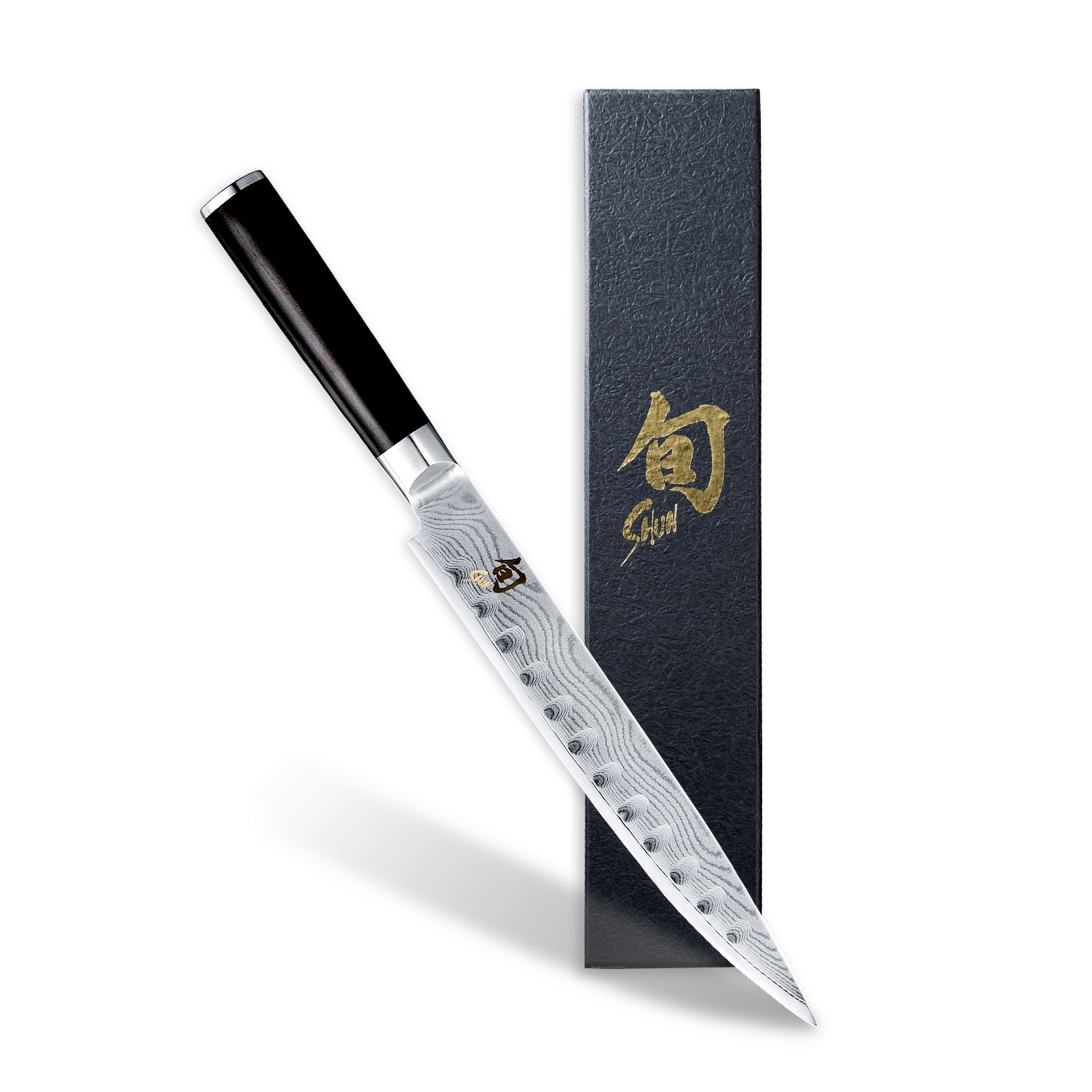 季節の移ろいをあじわい、より多彩に楽しむための包丁ブランド、「旬」。硬さの異なるステンレスを重ね合わせた33層構造により、刃体の表面に木目のように美しいダマスカス模様が広がります。貝印が長年の刃物作りで培ってきた刃付けの技術と、高硬度・高炭素のVG-MAX材を芯材に採用することで、鋭い切れ味が永く続きます。鋲を使わず美しく仕上げた積層強化木のD型ハンドルは手に程よくフィットします。