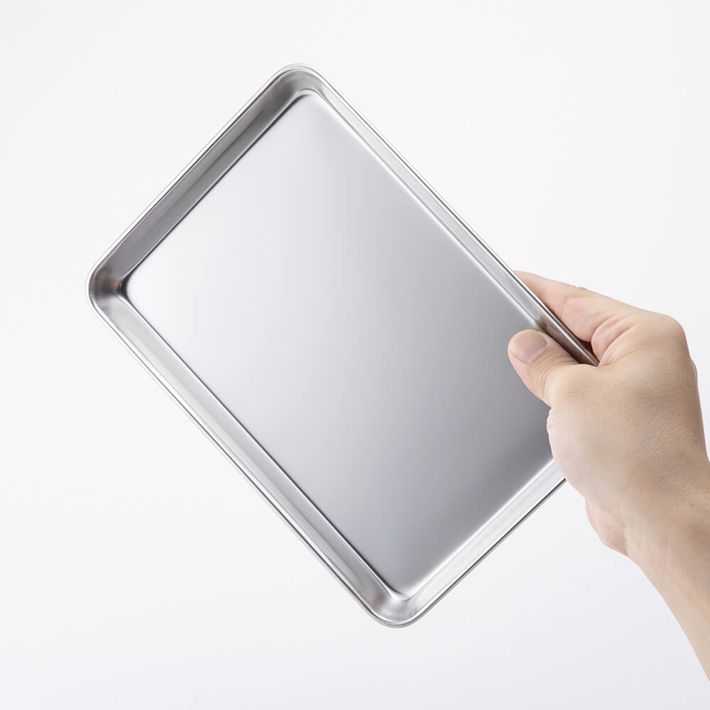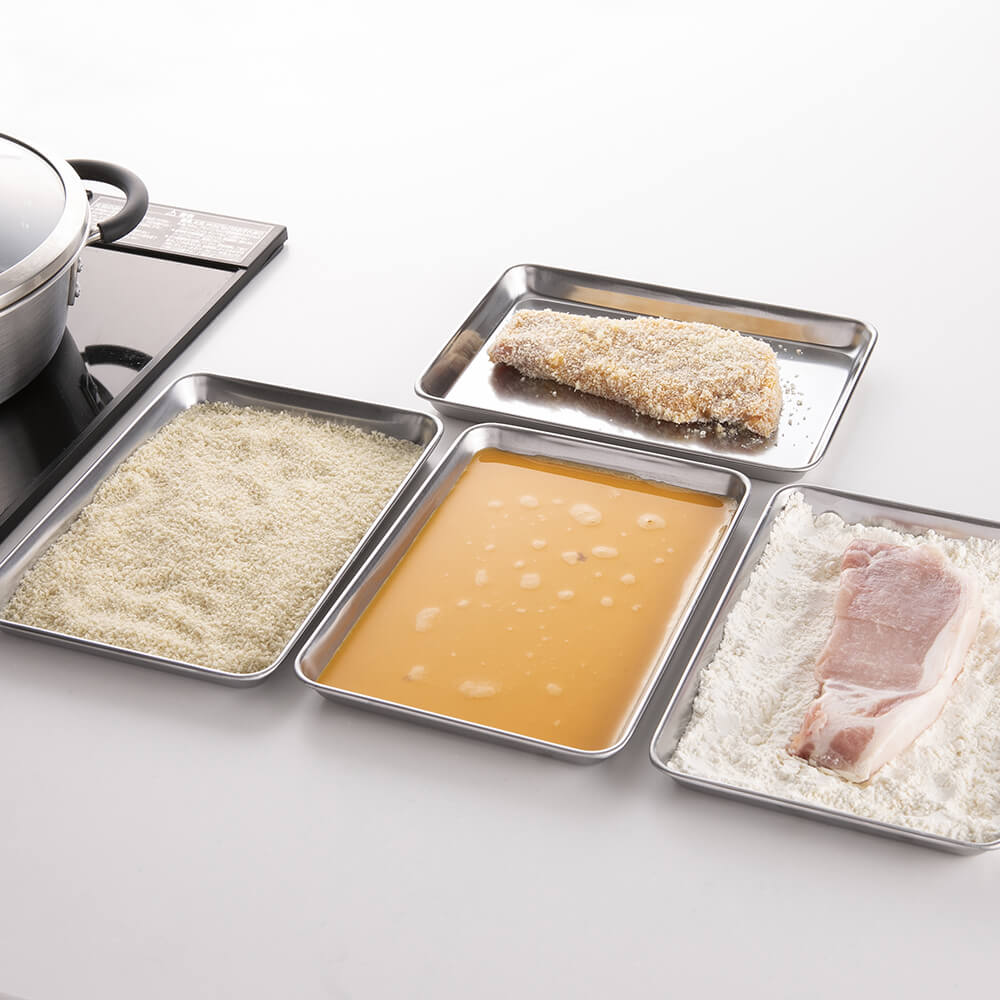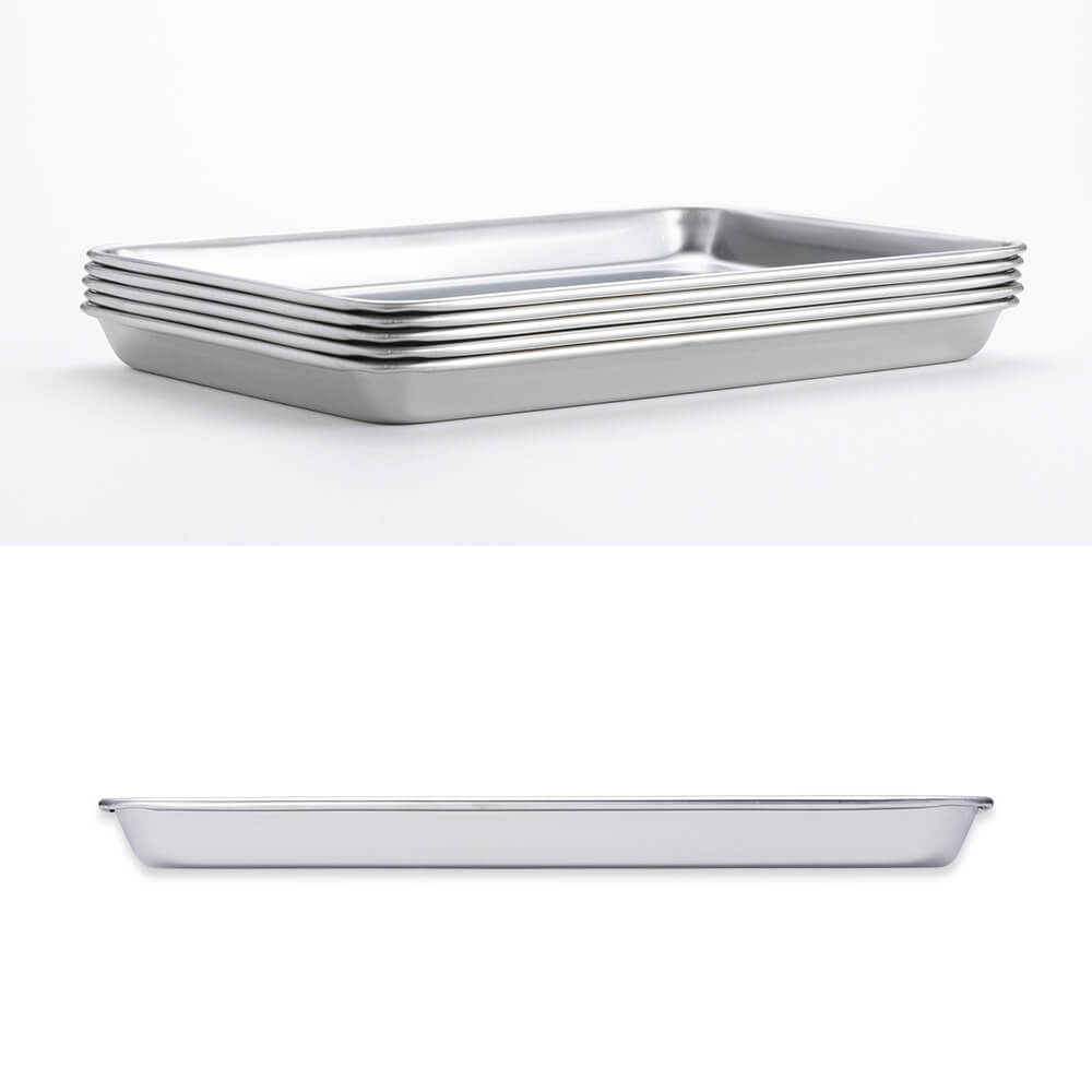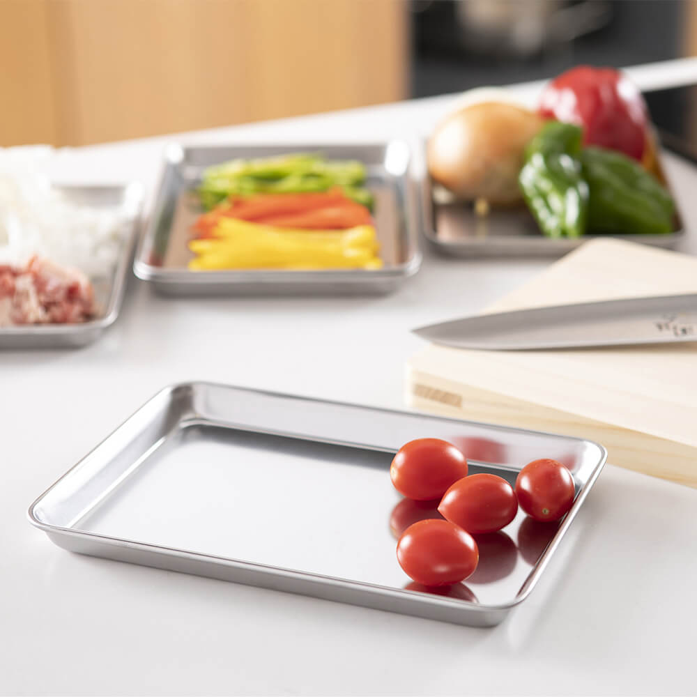 使わない時は重ねてコンパクトに収納できる、ステンレス製のトレー5枚セットです。