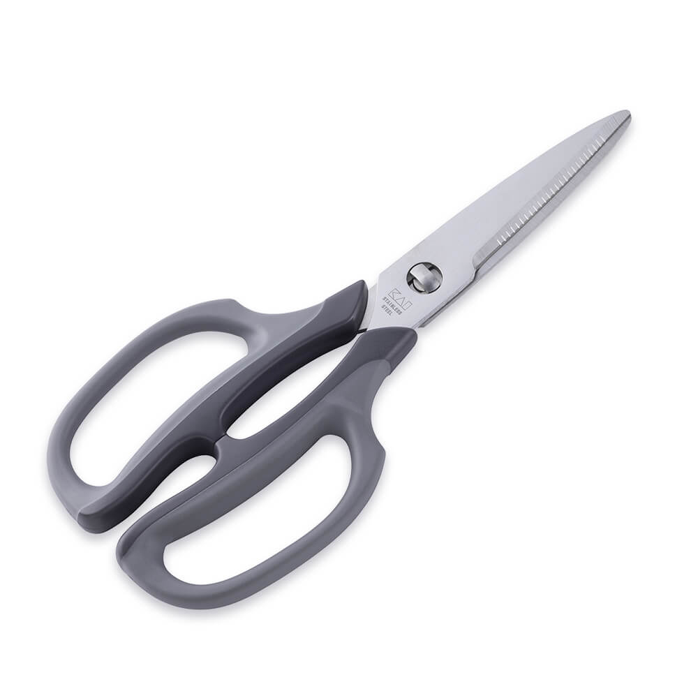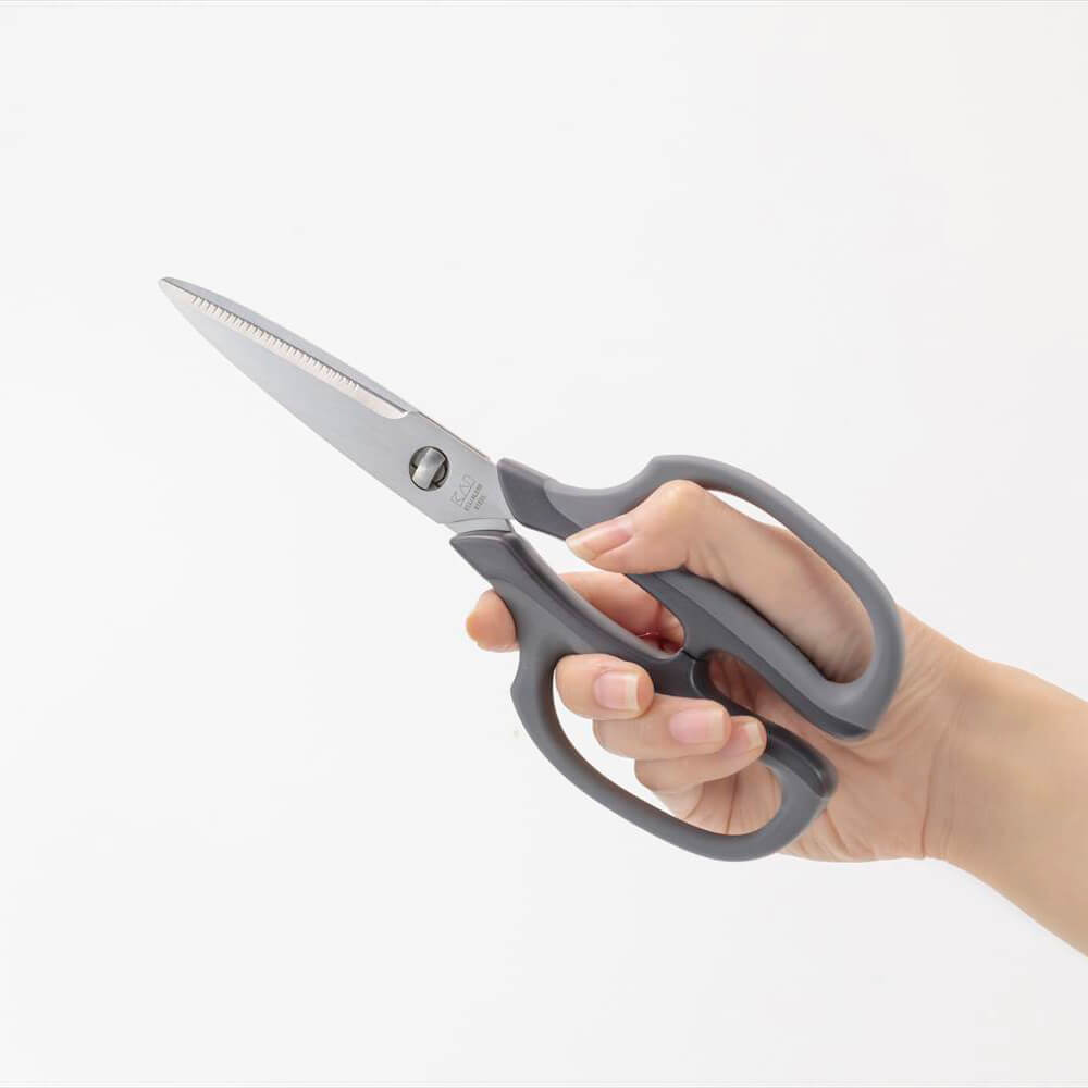 手あたりのやさしいハンドル素材と、切る食材をしっかりとつかみながら切る溝付きの刃構造のキッチンバサミ。