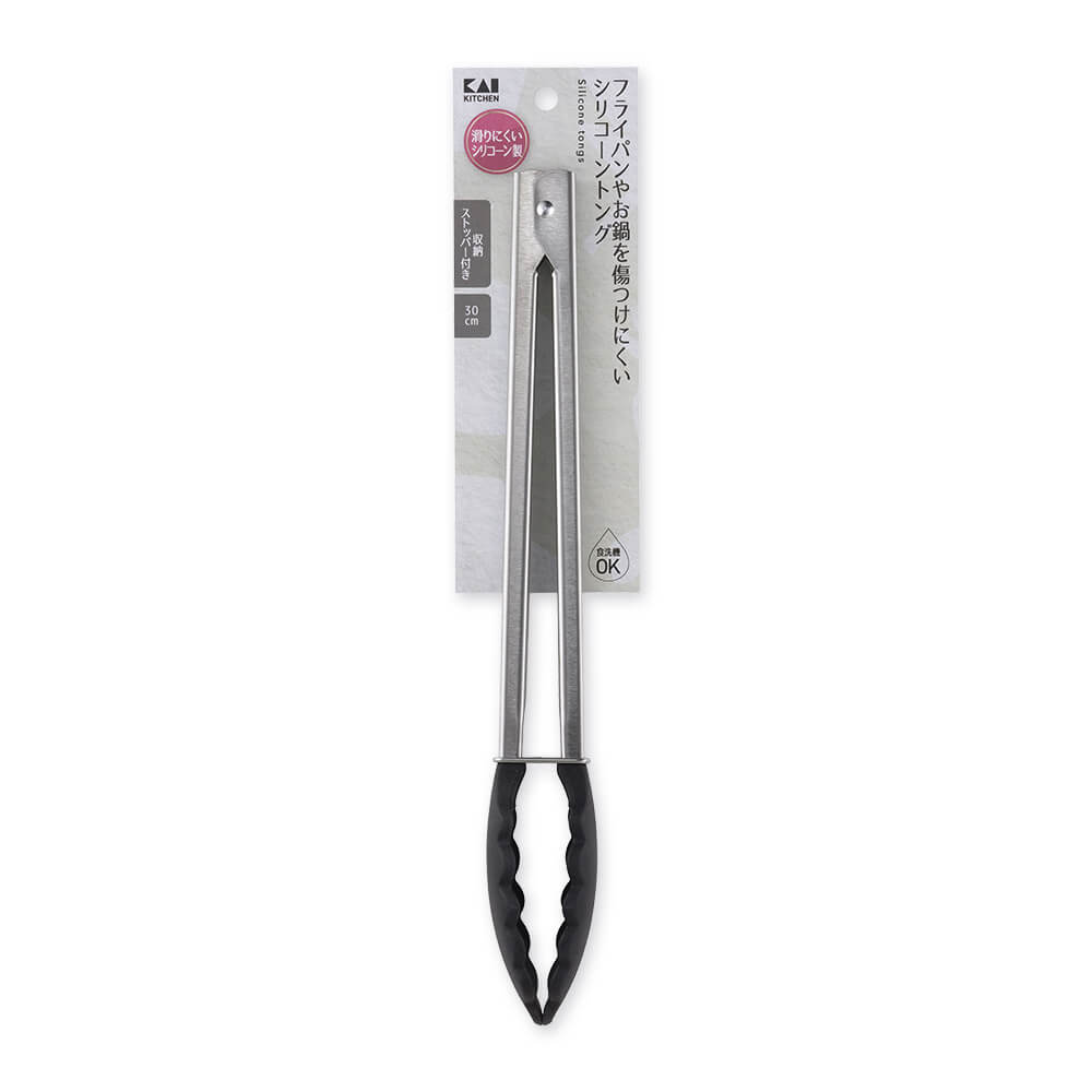 耐熱温度が高く、食材を滑らずつかみやすいシリコーン製。広がらずに収納できるストッパー付き。